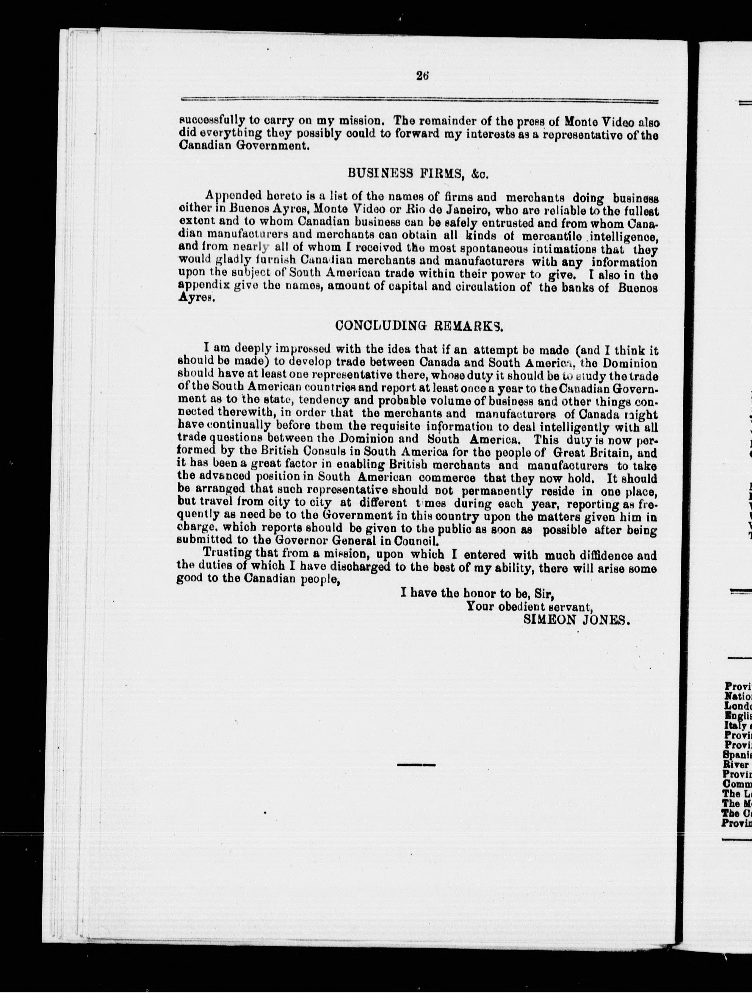 - Report of Simeon Jones, esq., commissioner to South America, to the Honorable George E. Foster, Finance Minister of the Dominion of Canada.