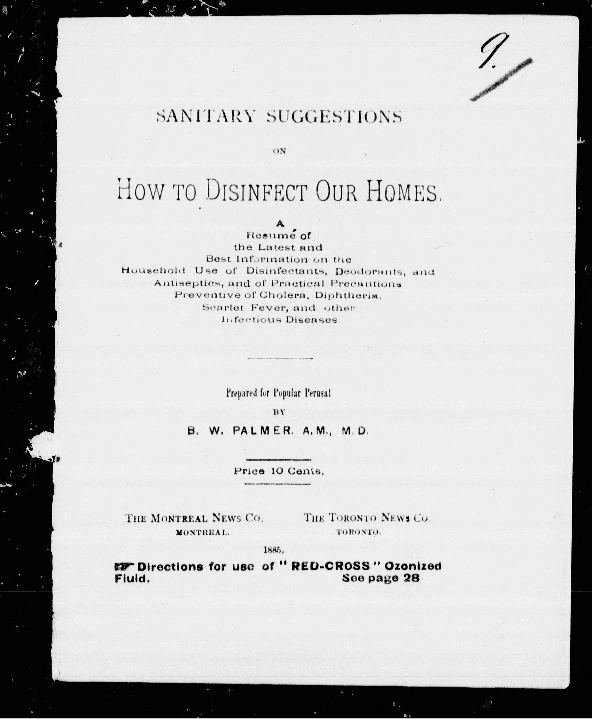 - Sanitary suggestions on how to disinfect our homes : a resumé of the latest and best information on the household use of disinfectants, deodorants, and antiseptics, and of practical precautions preventive of cholera, diphtheria, scarlet fever, and other infectious diseases : prepared for popular perusal