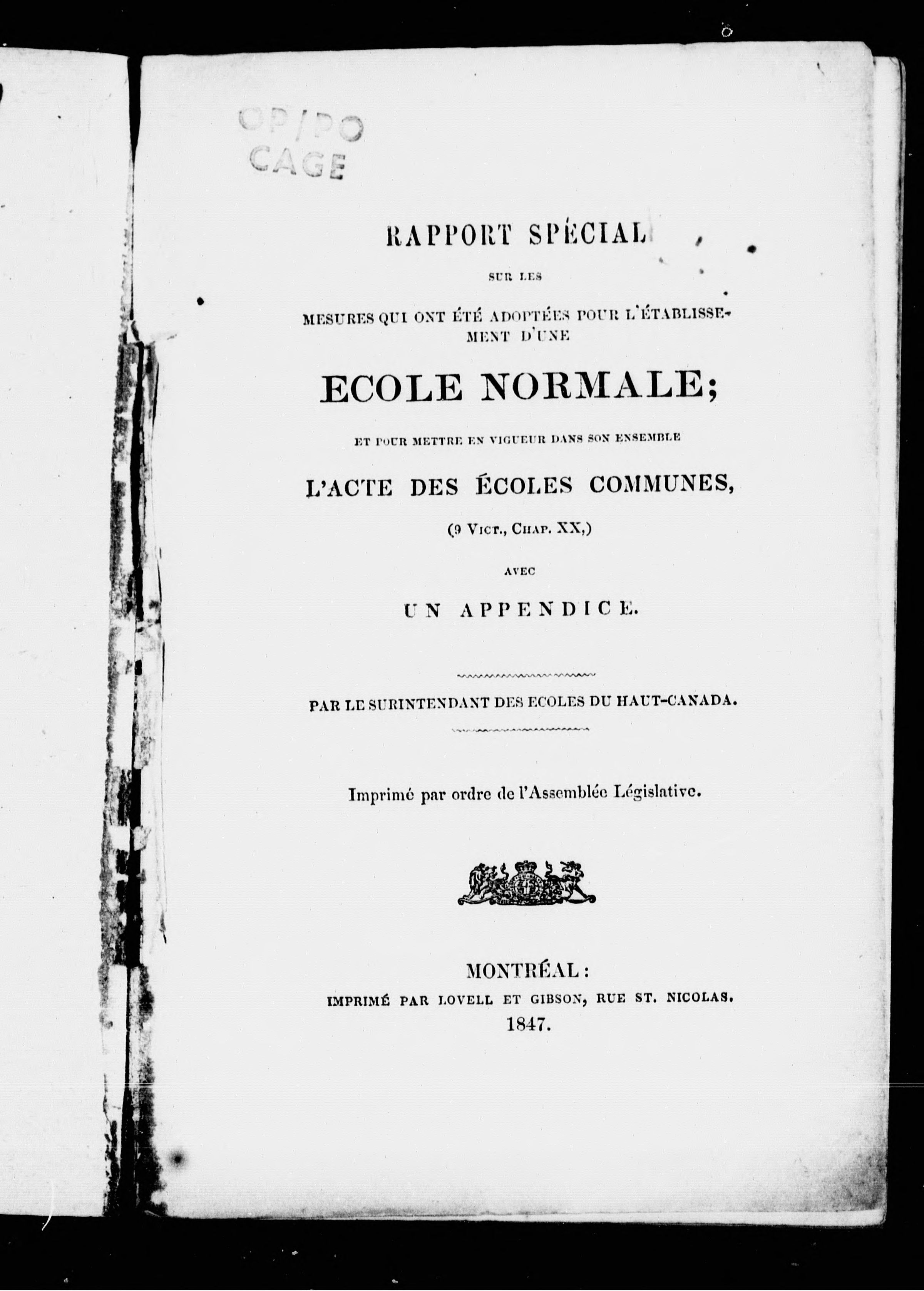 - Rapport spécial sur les mesures qui ont été adoptées pour l'établissement d'une école normale : et pour mettre en vigueur dans son ensemble l'Acte des écoles communes 9 Vict., chap. XX avec un appendice