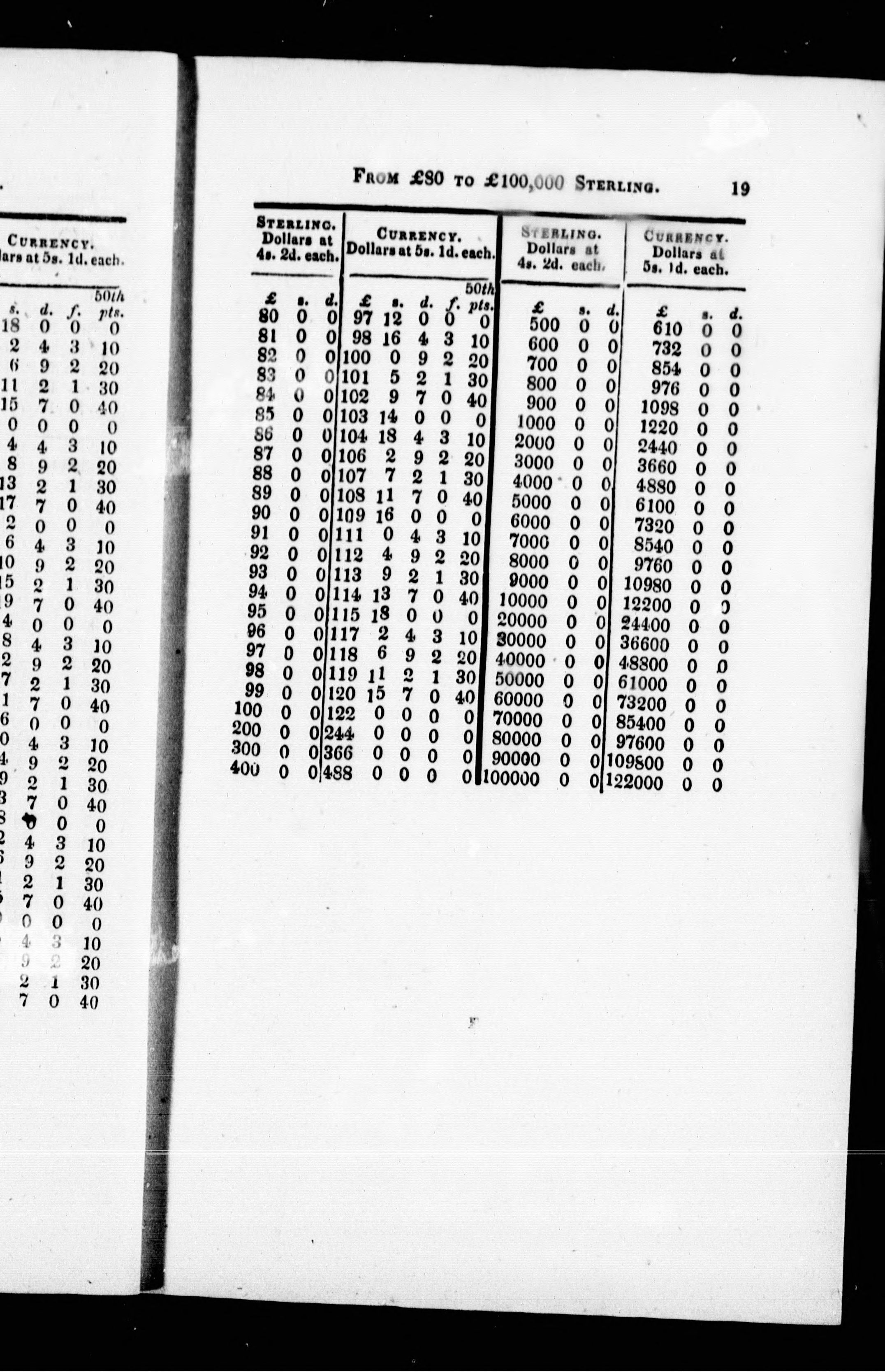 - A table of computations, converting sterling, dollars at 4s. 2d. into currency, dollars at 5s. 1d. each, and vice versa : in a progressive series, from 1 farthing to £100,000