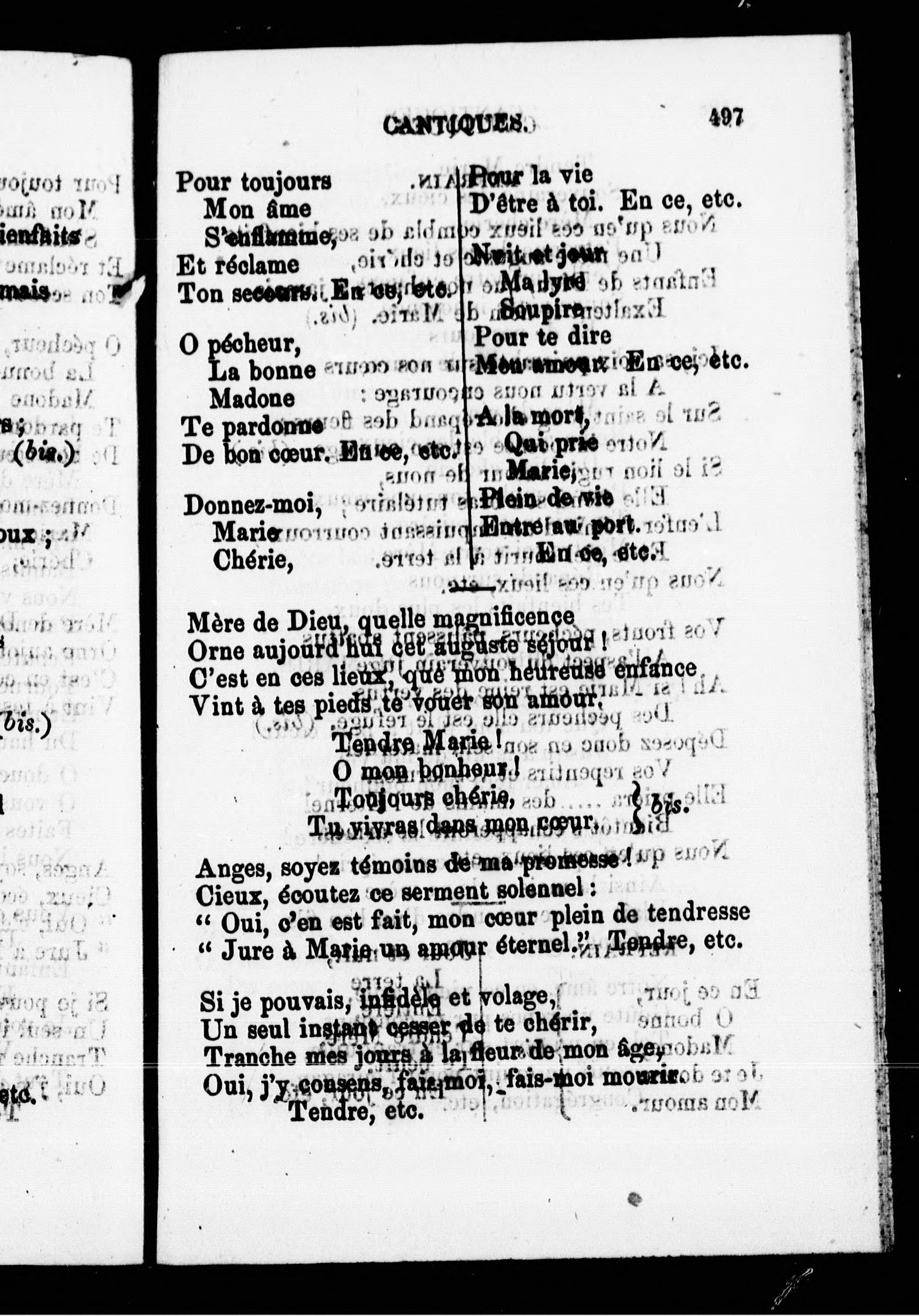 Manuel de piété : contenant les prières du matin, du soir, de la messe, de la confession, de la communion et autres pour tous les besoins de la vie, l'office des dimanches, les vêpres des principales fêtes de l'année : aussi les offices de la Ste. Vierge et des morts : suivi du chemin de la croix et de cantiques pour tout le temps de l'année.