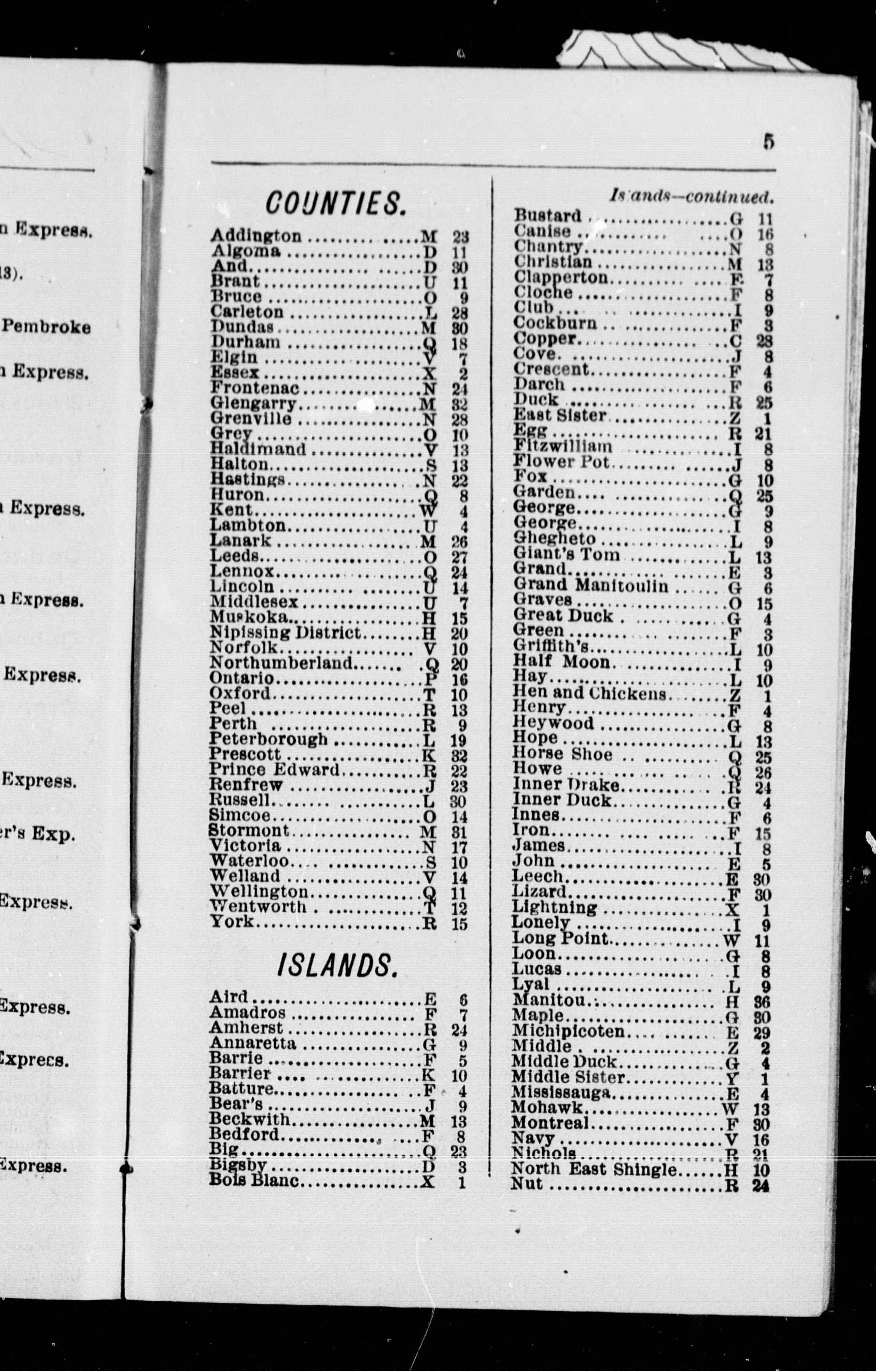 The gazetteer with indexed map of Ontario ..., showing the railroads and the express company doing business over each : also, counties, islands, lakes & rivers, together with every post office, railroad station or town, carefully indexed, referring to the exact location where each may be found on the map