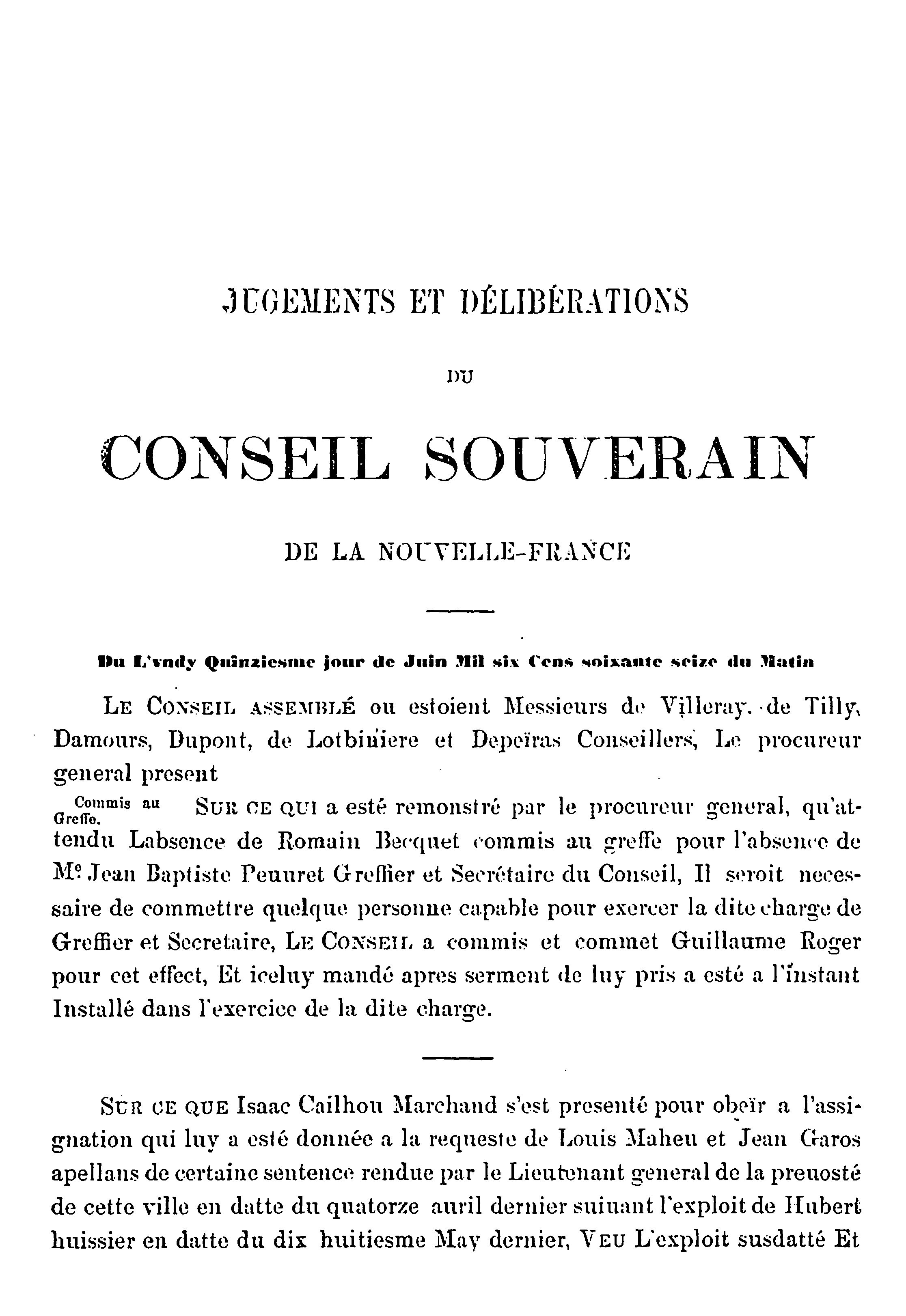 Jugements et délibérations du Conseil souverain de la Nouvelle-France