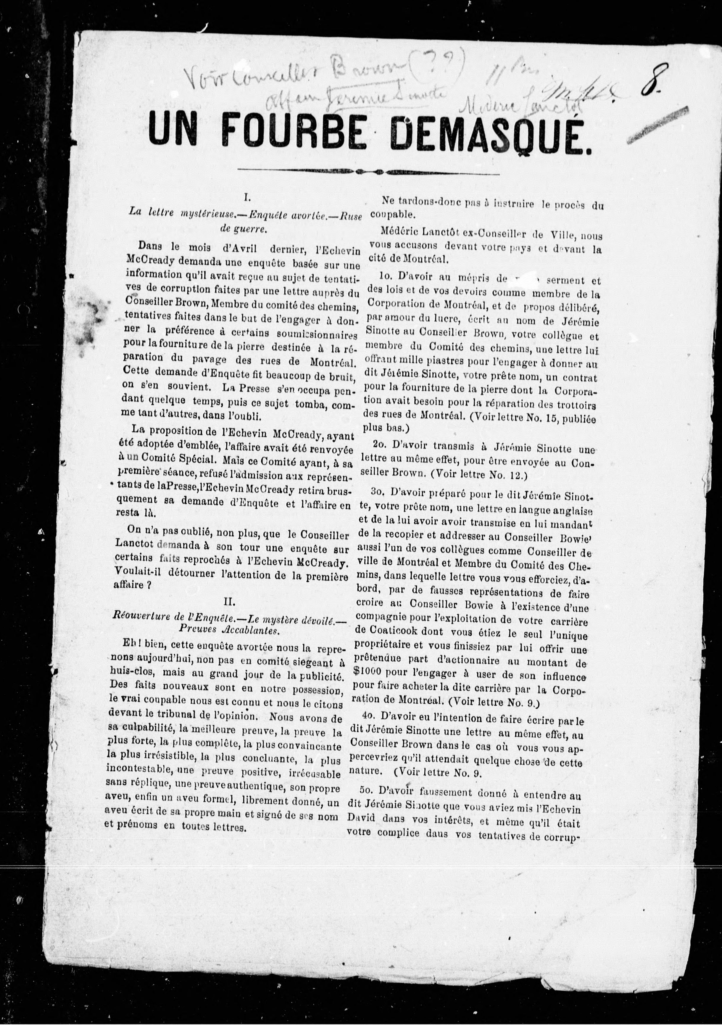 Ouvrage révélent des activités malhonnêtes de la part de Médéric Lanctot dont l'élection au conseil municipal de Montréal était contestée.