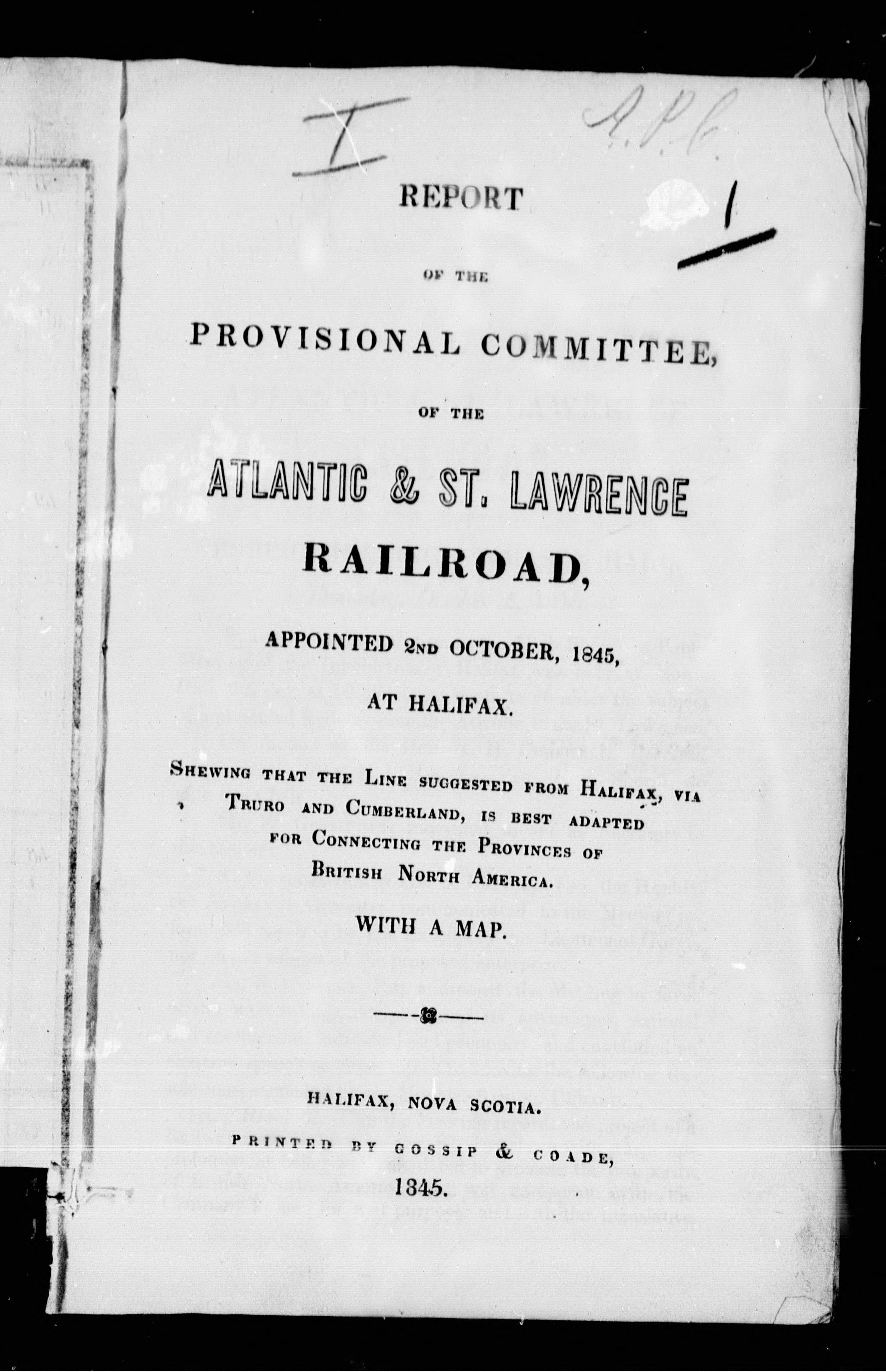 Report of the Provisional Committee, of the Atlantic & St. Lawrence Railroad, appointed 2nd October, 1845, at Halifax : shewing that the line suggested from Halifax, via Truro and Cumberland, is best adapted for connecting the provinces of British North America : with a map. - Adresse bibliographique