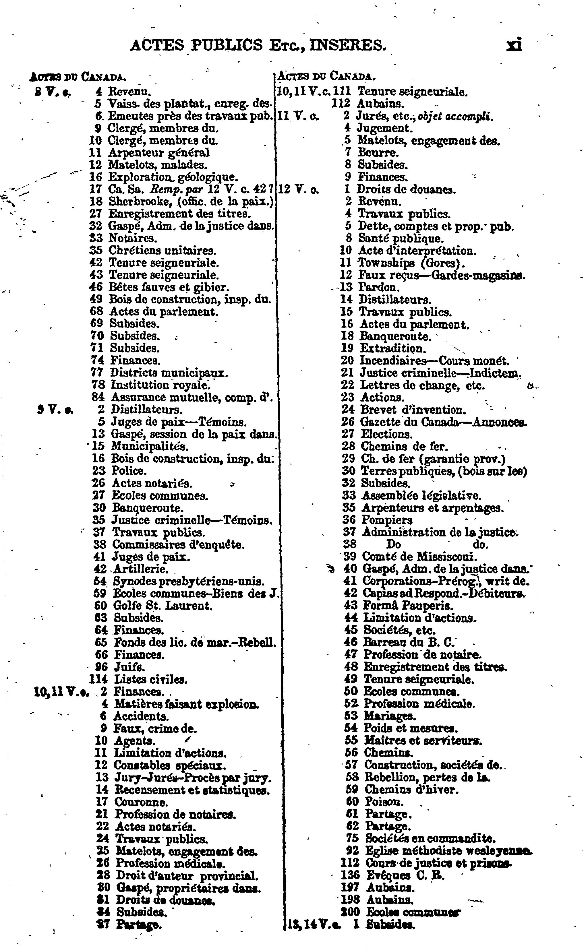 Index des statuts en force dans le Bas Canada, à la fin de la session de 1856 :