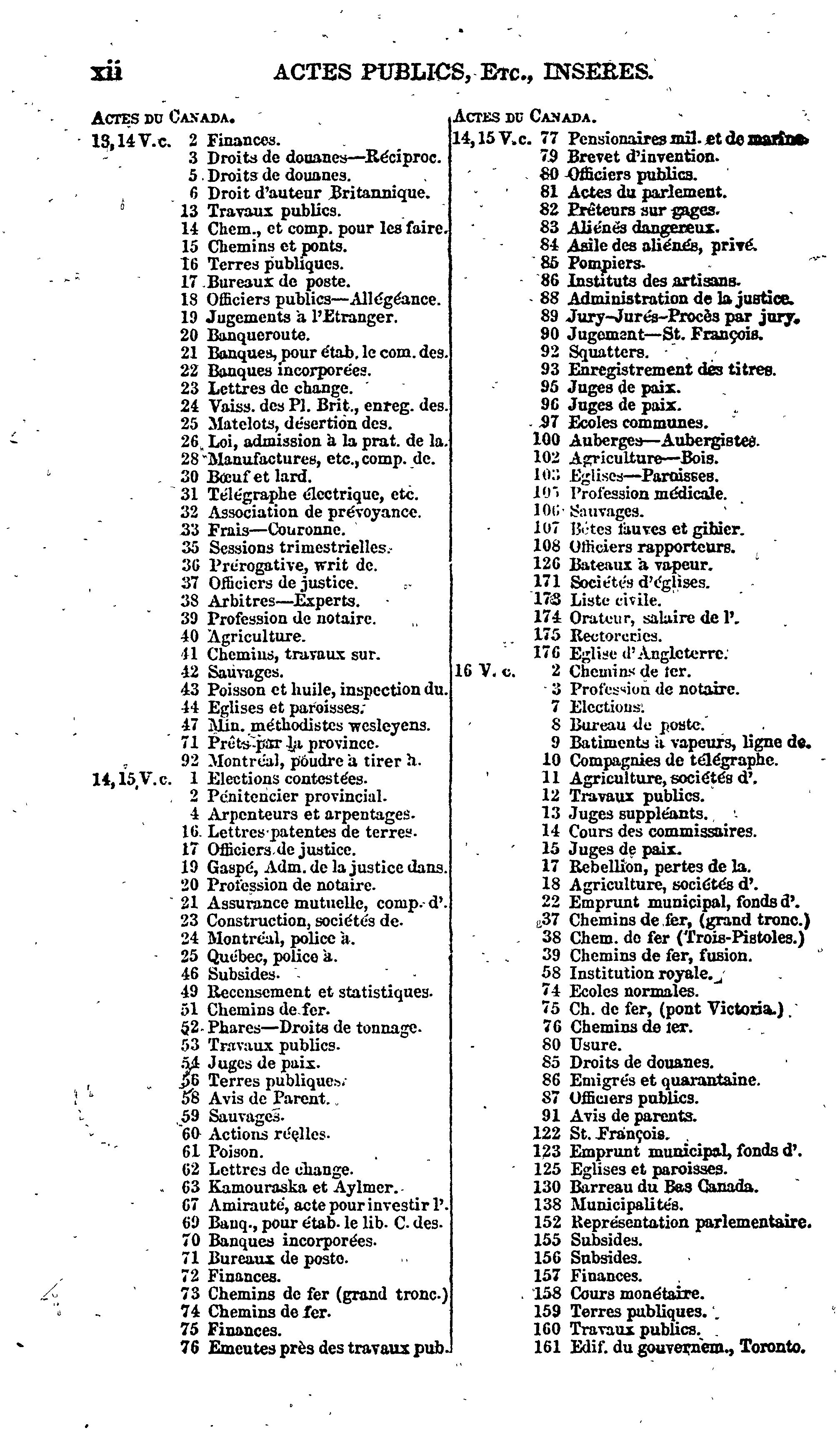 Index des statuts en force dans le Bas Canada, à la fin de la session de 1856 :
