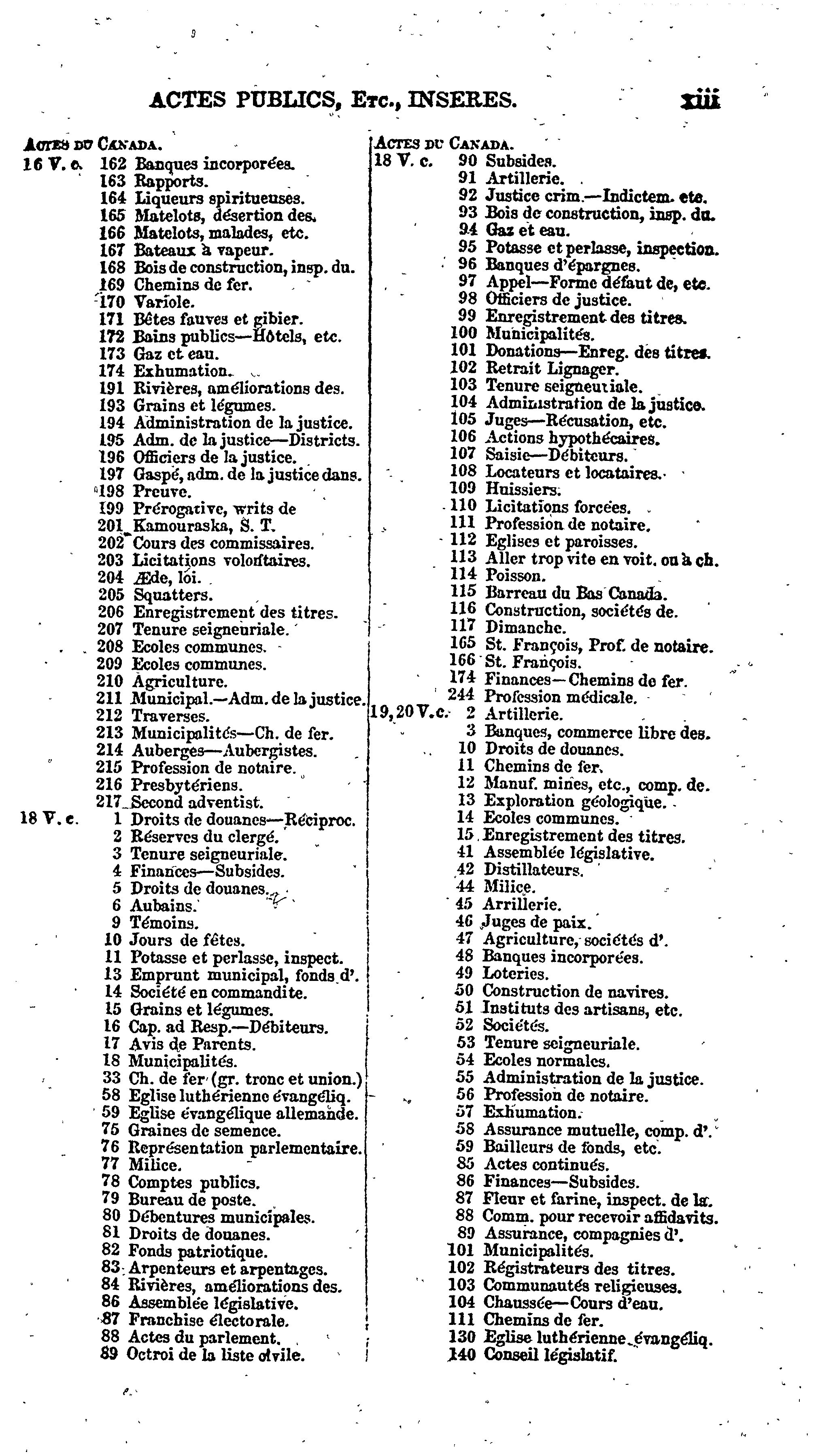 Index des statuts en force dans le Bas Canada, à la fin de la session de 1856 :