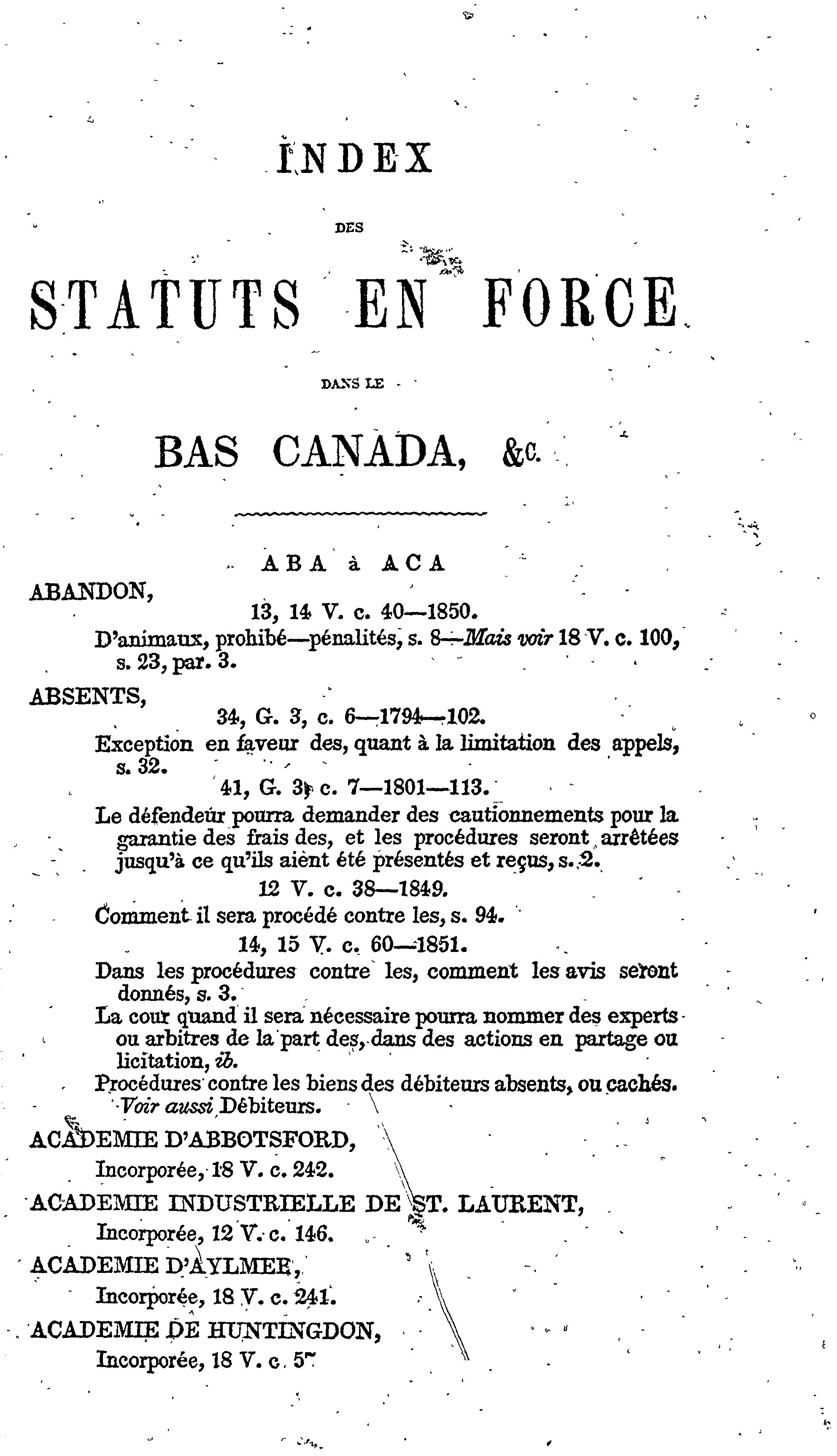 Index des statuts en force dans le Bas Canada, à la fin de la session de 1856 :