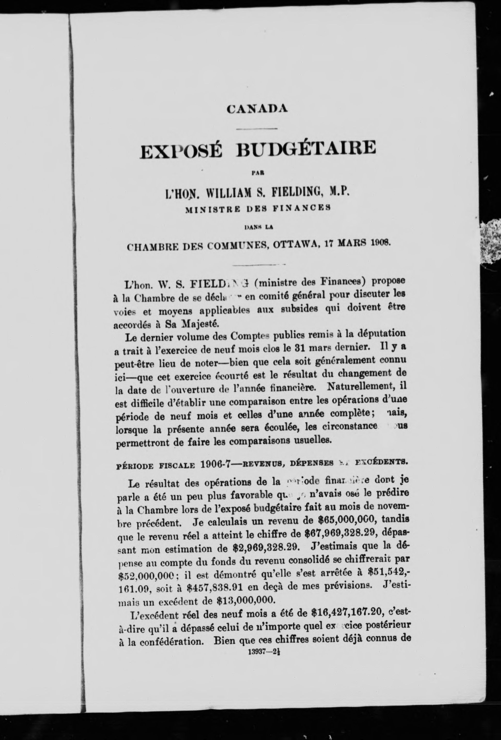 - Exposé budgétaire par l'Hon. William S. Fielding, M.P. Ministre des Finances, Chambre des communes, mardi, 17 mars, 1908.