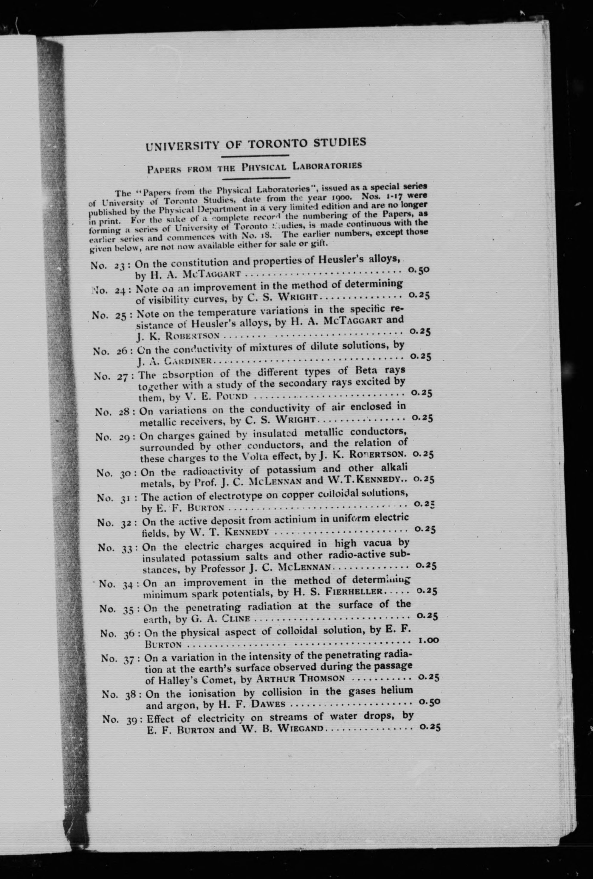 Original issued in series: University of Toronto studies. Papers from the physical laboratories ; numbers 59.