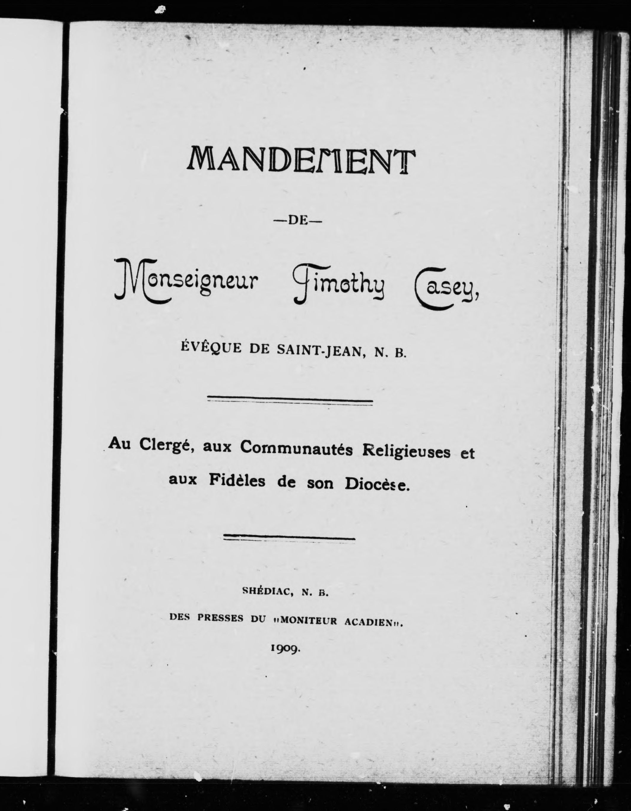 Mandement de Monseigneur Timothy Casey, évêque de Saint-Jean, N.B. : au clergé, aux communautés religieuses, et aux fidèles de son diocèse. - Adresse bibliographique