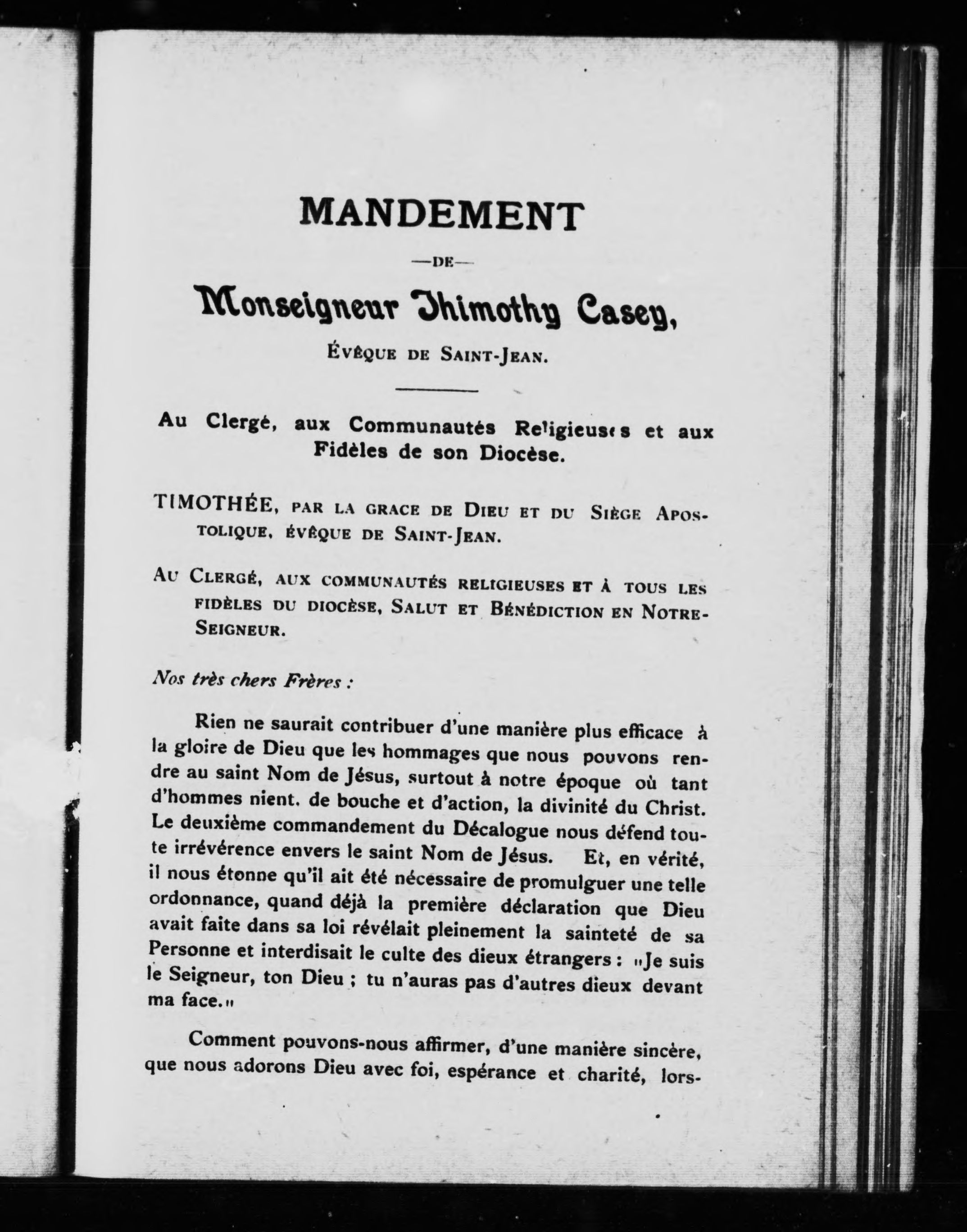 Mandement de Monseigneur Timothy Casey, évêque de Saint-Jean, N.B. :