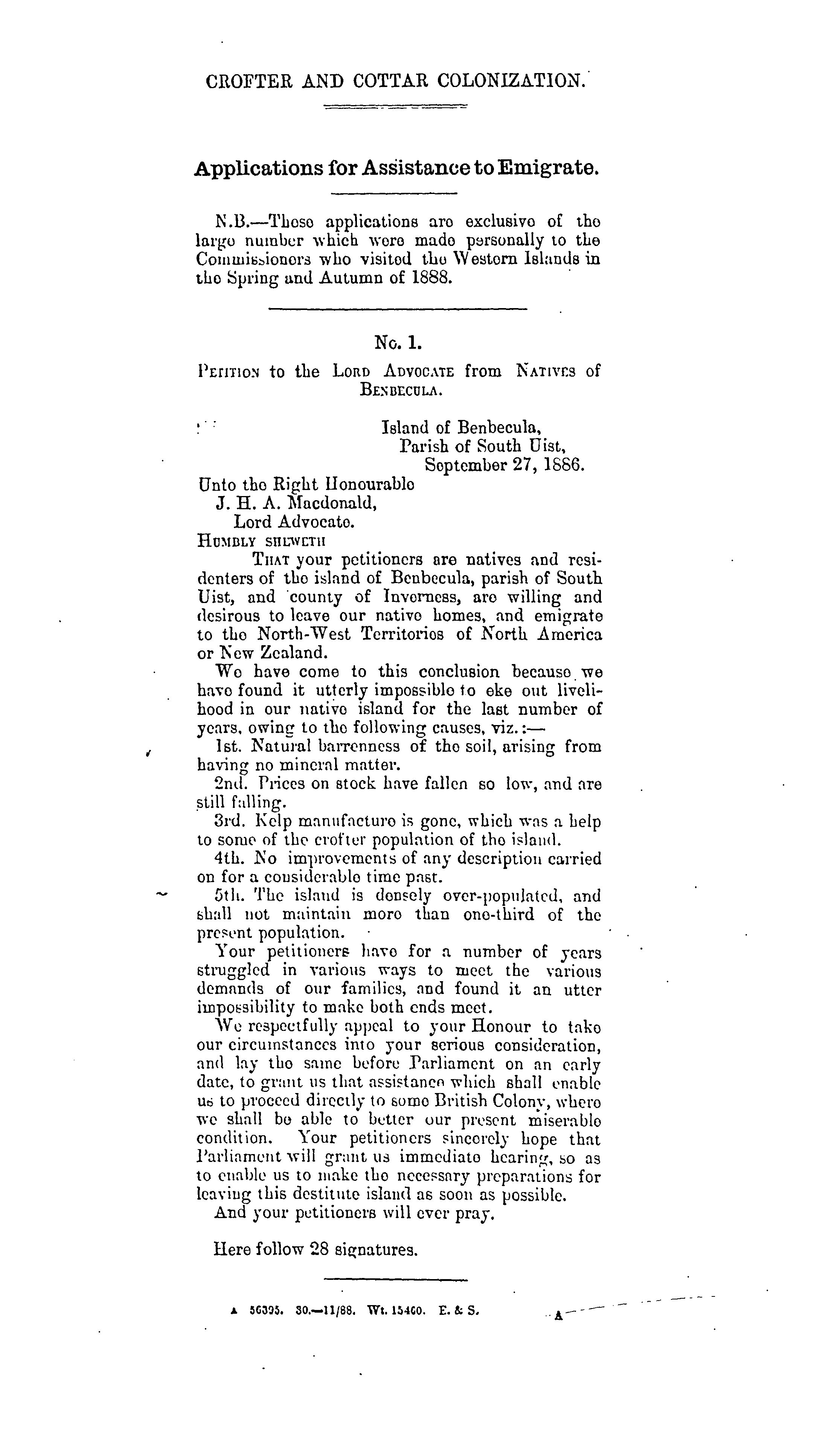 "Schedule of names of crofters settled near Pelican Lake, Manitoba ..."--p. 6-10.