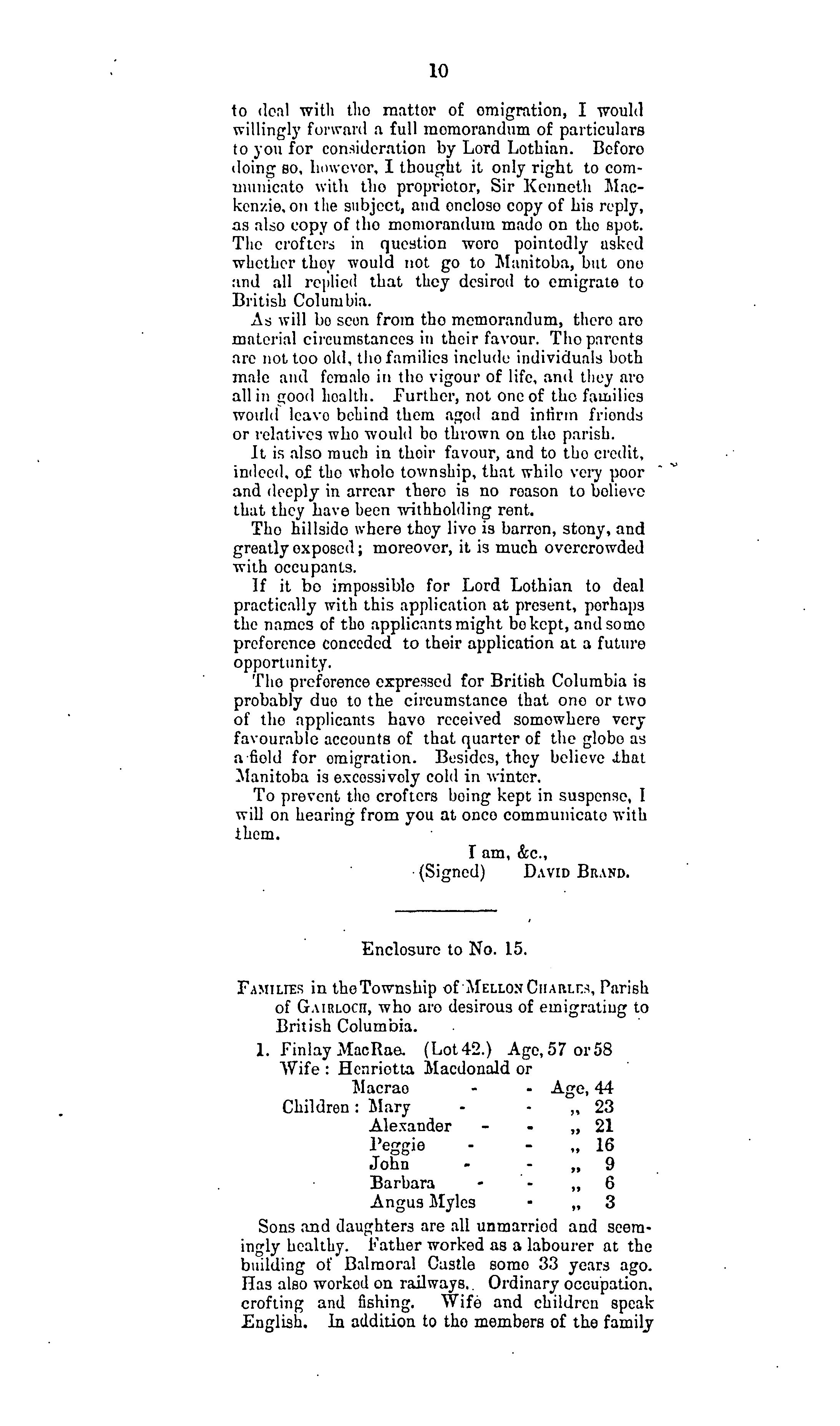 Letter addressed from "W.W." to the Marquis of Lothian, Secretary of Scotland concerning Scottish emigration to Killarney, Manitoba: 2 pages at end.