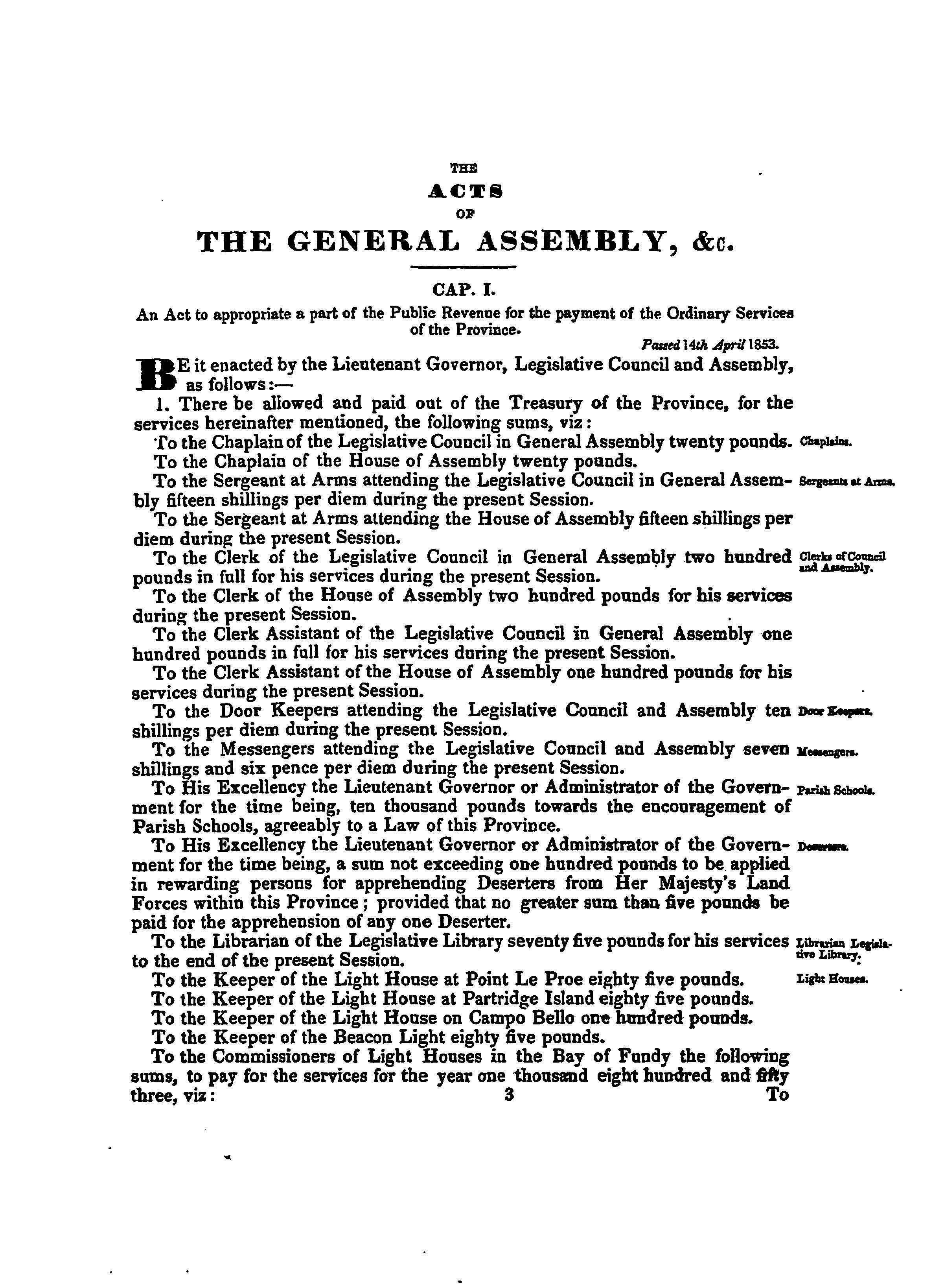 - Acts of the General Assembly of Her Majesty's province of New Brunswick passed in the month of October, 1852 and in the months of April and May, 1853 : 1852/53