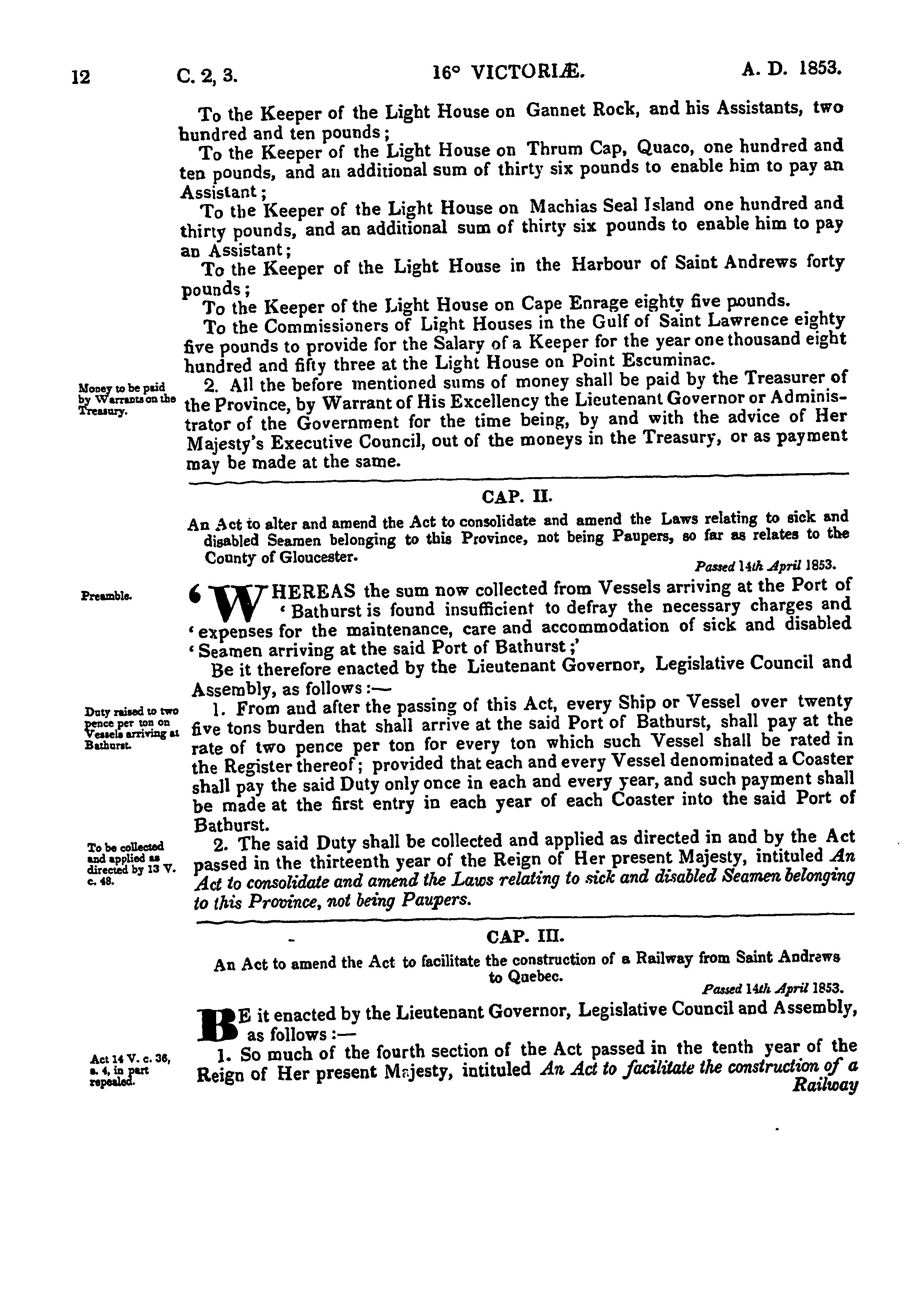 - Acts of the General Assembly of Her Majesty's province of New Brunswick passed in the month of October, 1852 and in the months of April and May, 1853 : 1852/53