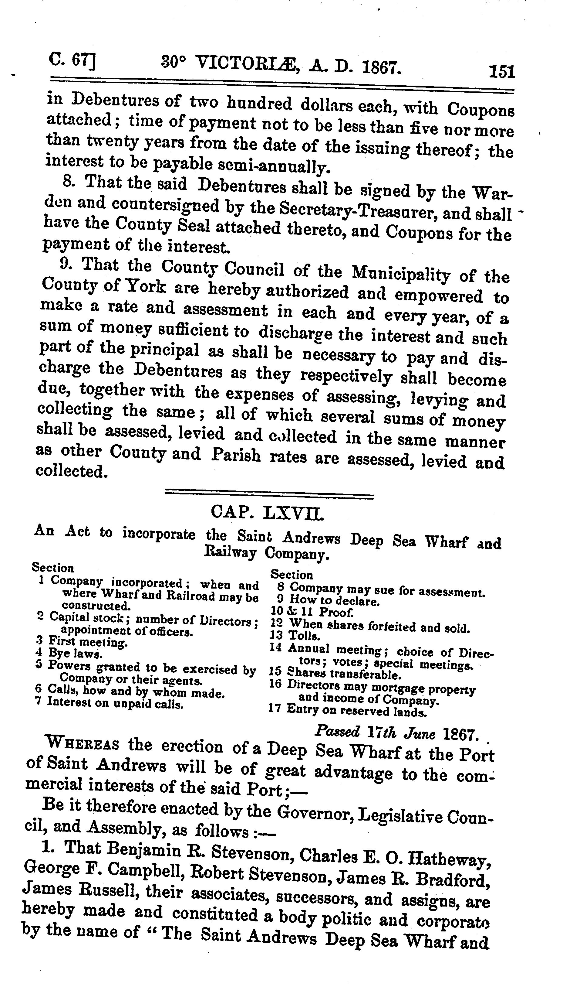 Acts of the General Assembly of Her Majesty's province of New Brunswick passed in the month of June, 1867 : 1867