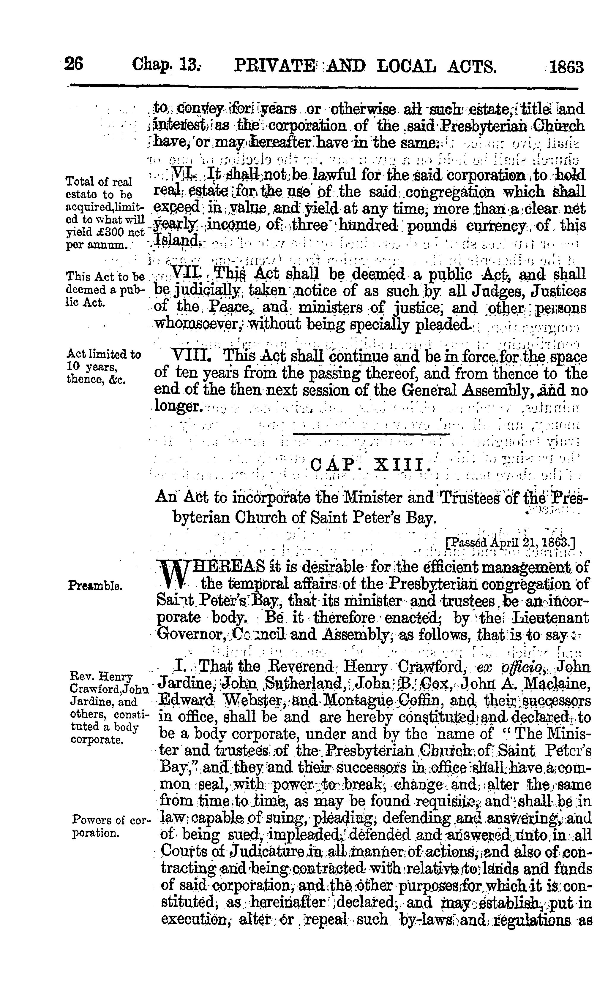 The private and local acts of the General Assembly of Prince Edward Island ... : from the twenty-sixth year of the reign of Her Most Gracious Majesty Queen Victoria, A.D. 1863 to the thirty-first year of the same reign, A.D. 1868.