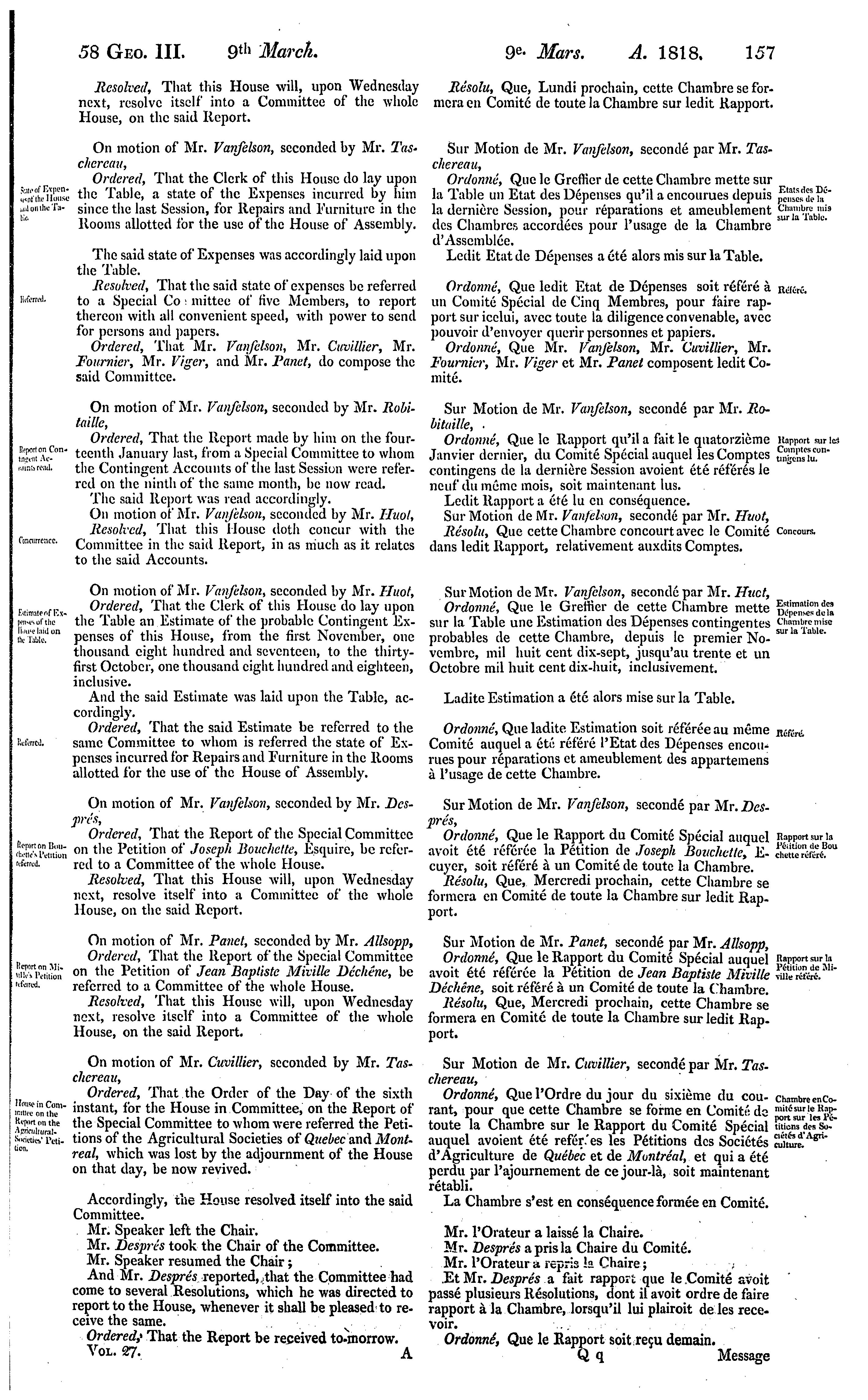 Journaux de la Chambre d'assemblée du Bas-Canada, depuis le 7e janvier, jusqu'au 1er avril, 1818, dans la cinquante-huitième année du règne de sa Majesté George Trois, étant la seconde session du neuvième Parlement provincial de cette province, sess. 1818 - Adresse bibliographique