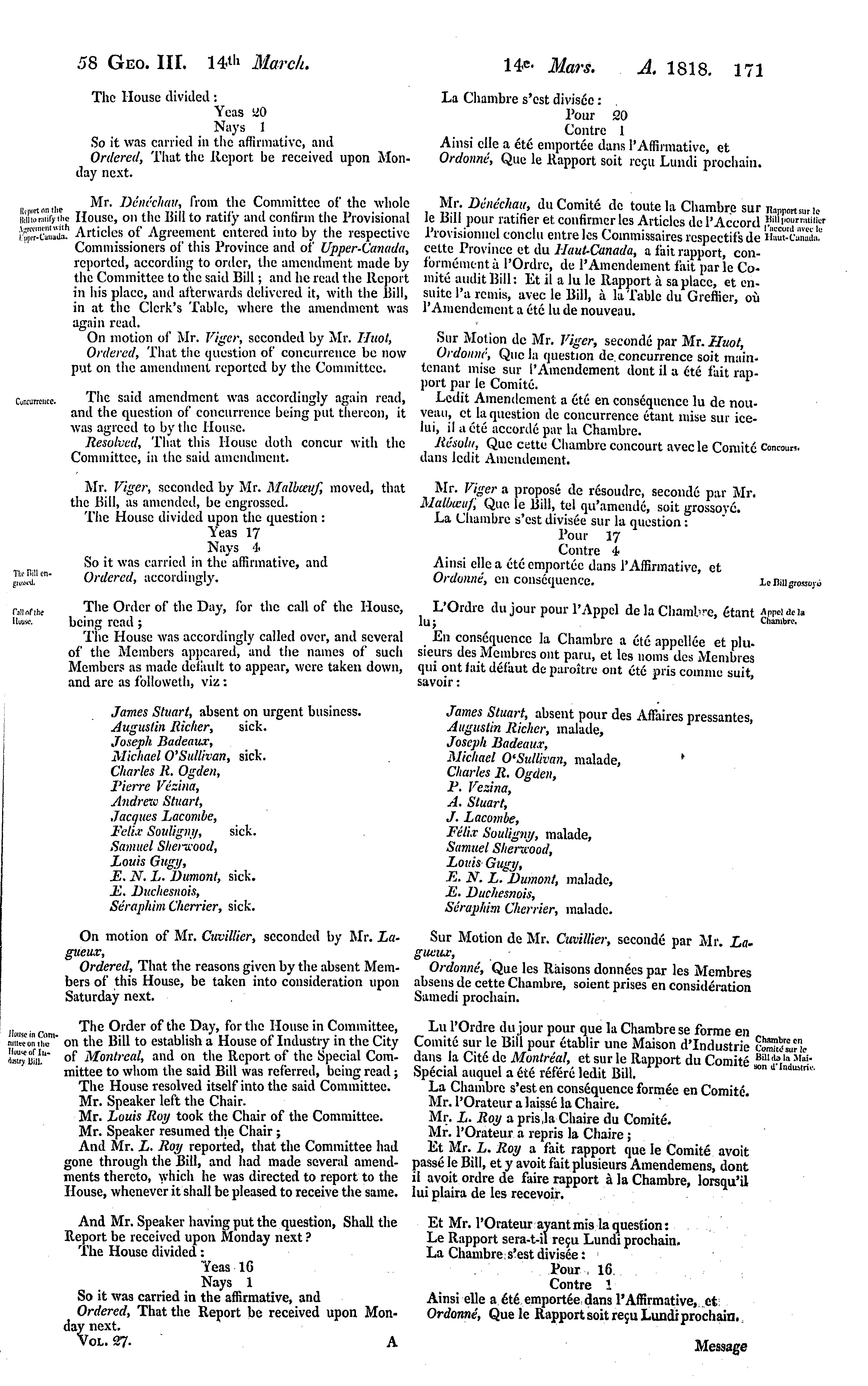 Journaux de la Chambre d'assemblée du Bas-Canada, depuis le 7e janvier, jusqu'au 1er avril, 1818, dans la cinquante-huitième année du règne de sa Majesté George Trois, étant la seconde session du neuvième Parlement provincial de cette province, sess. 1818 - Adresse bibliographique