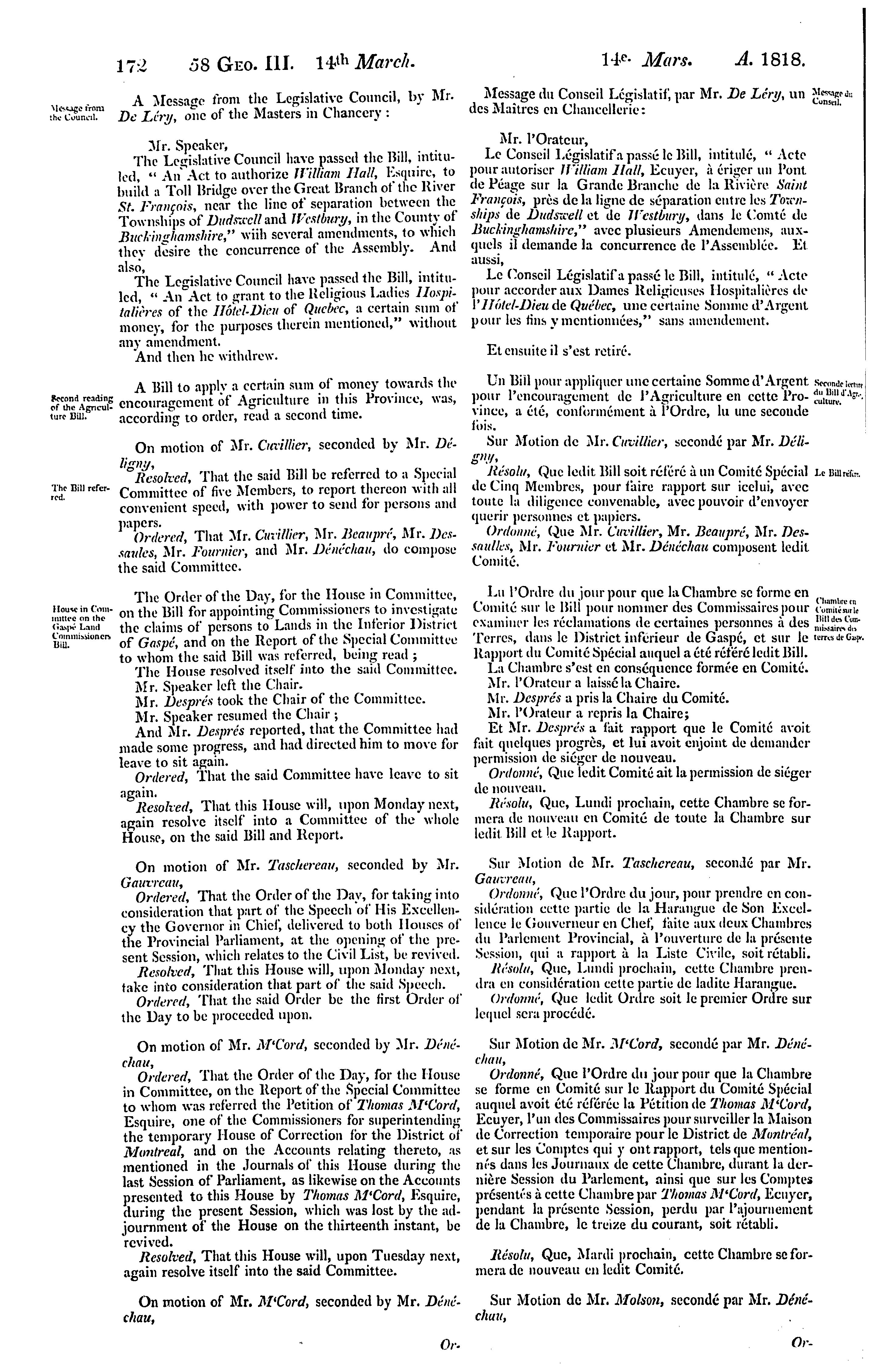 Journaux de la Chambre d'assemblée du Bas-Canada, depuis le 7e janvier, jusqu'au 1er avril, 1818, dans la cinquante-huitième année du règne de sa Majesté George Trois, étant la seconde session du neuvième Parlement provincial de cette province, sess. 1818 - Adresse bibliographique