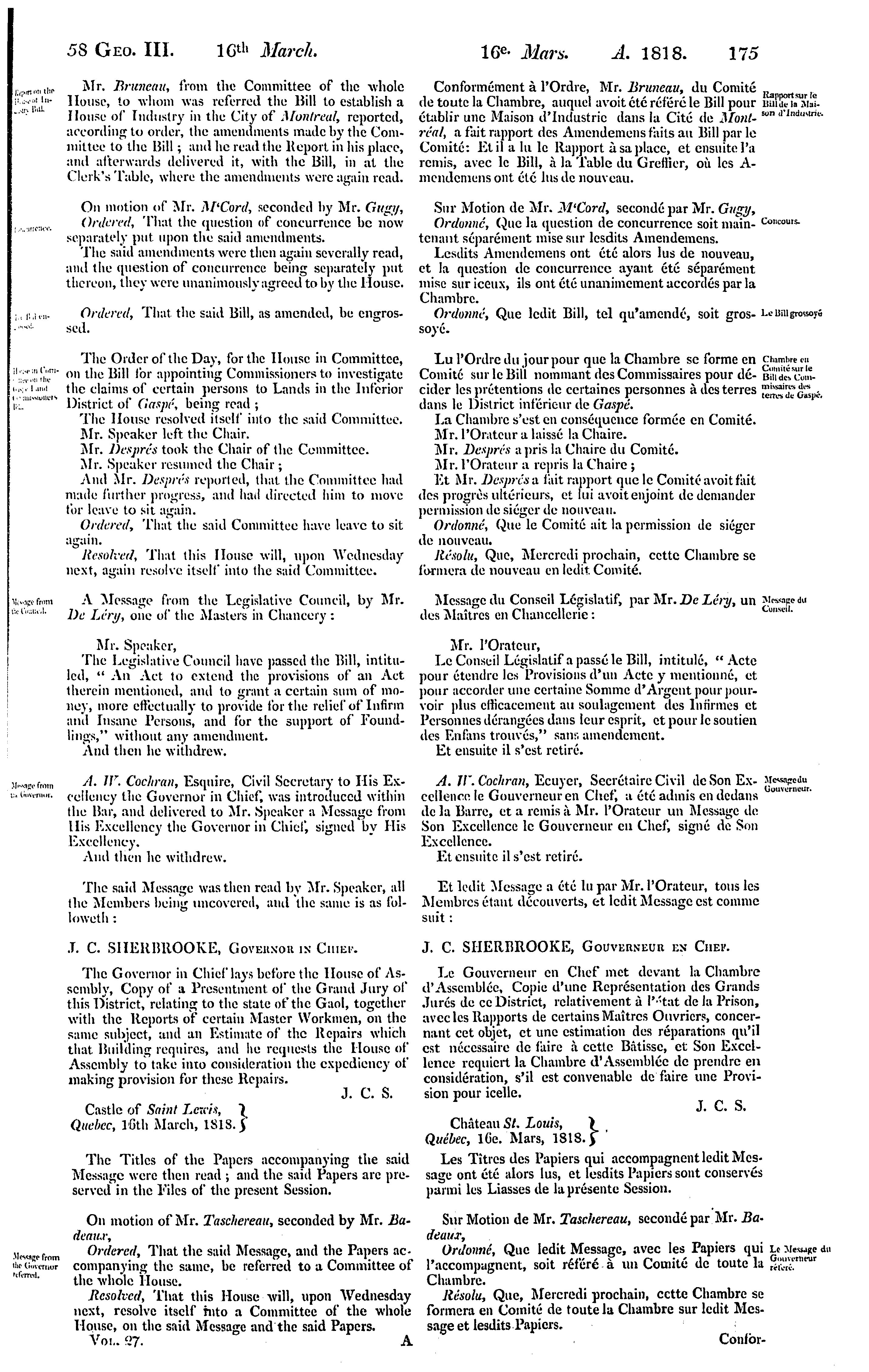 Journaux de la Chambre d'assemblée du Bas-Canada, depuis le 7e janvier, jusqu'au 1er avril, 1818, dans la cinquante-huitième année du règne de sa Majesté George Trois, étant la seconde session du neuvième Parlement provincial de cette province, sess. 1818 - Adresse bibliographique