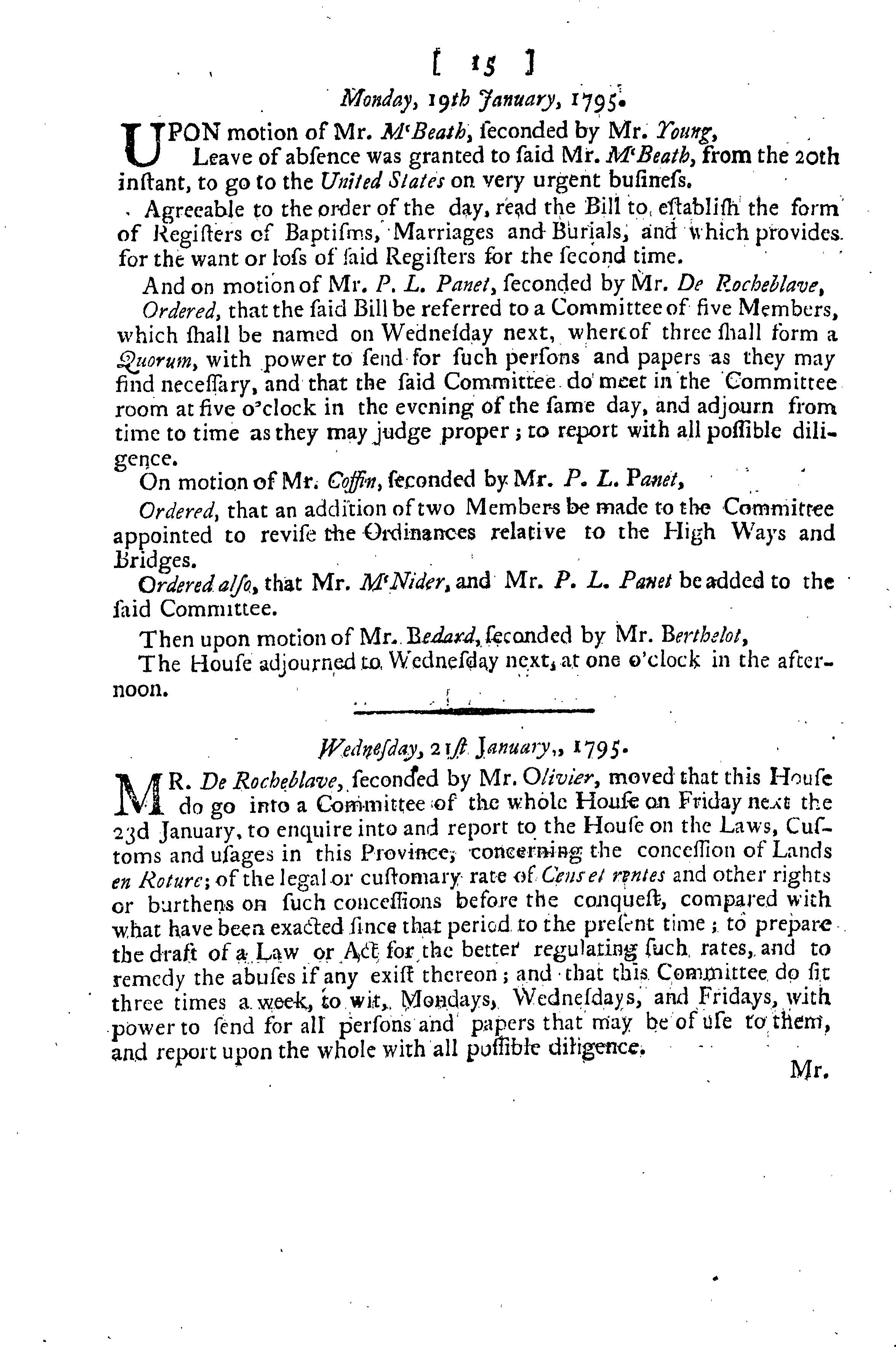 Journal de la Chambre d'assemblée du Bas-Canada du 5me janvier, au 7me mai 1795, inclusivement