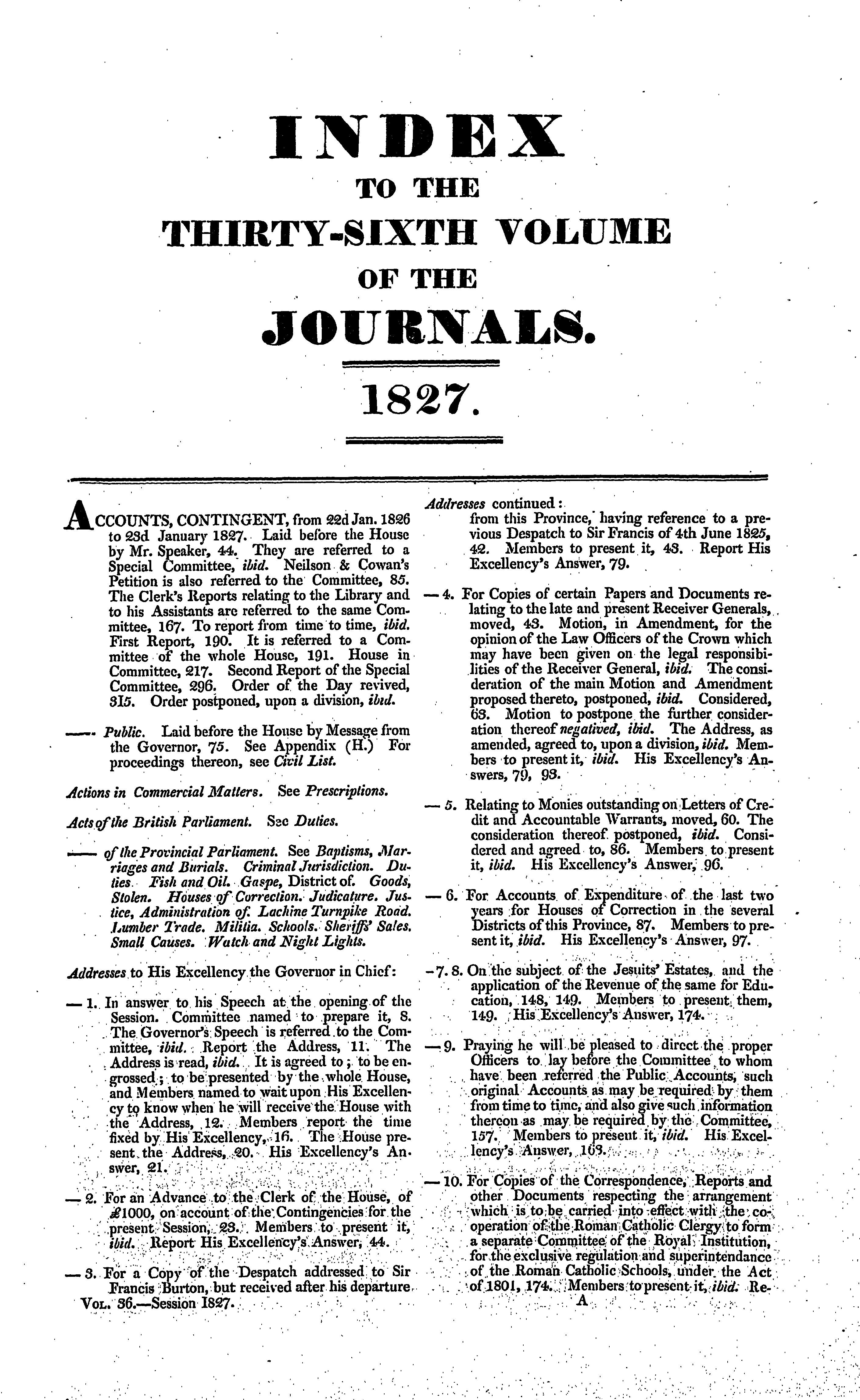 Journaux de la Chambre d'assemblée du Bas-Canada, depuis le 23 janvier jusqu'au 7 mars 1827, dans la septième et huitième années du règne du Roi George Quatre, étant la troisième session du douzième Parlement provincial de cette province, sess. 1827