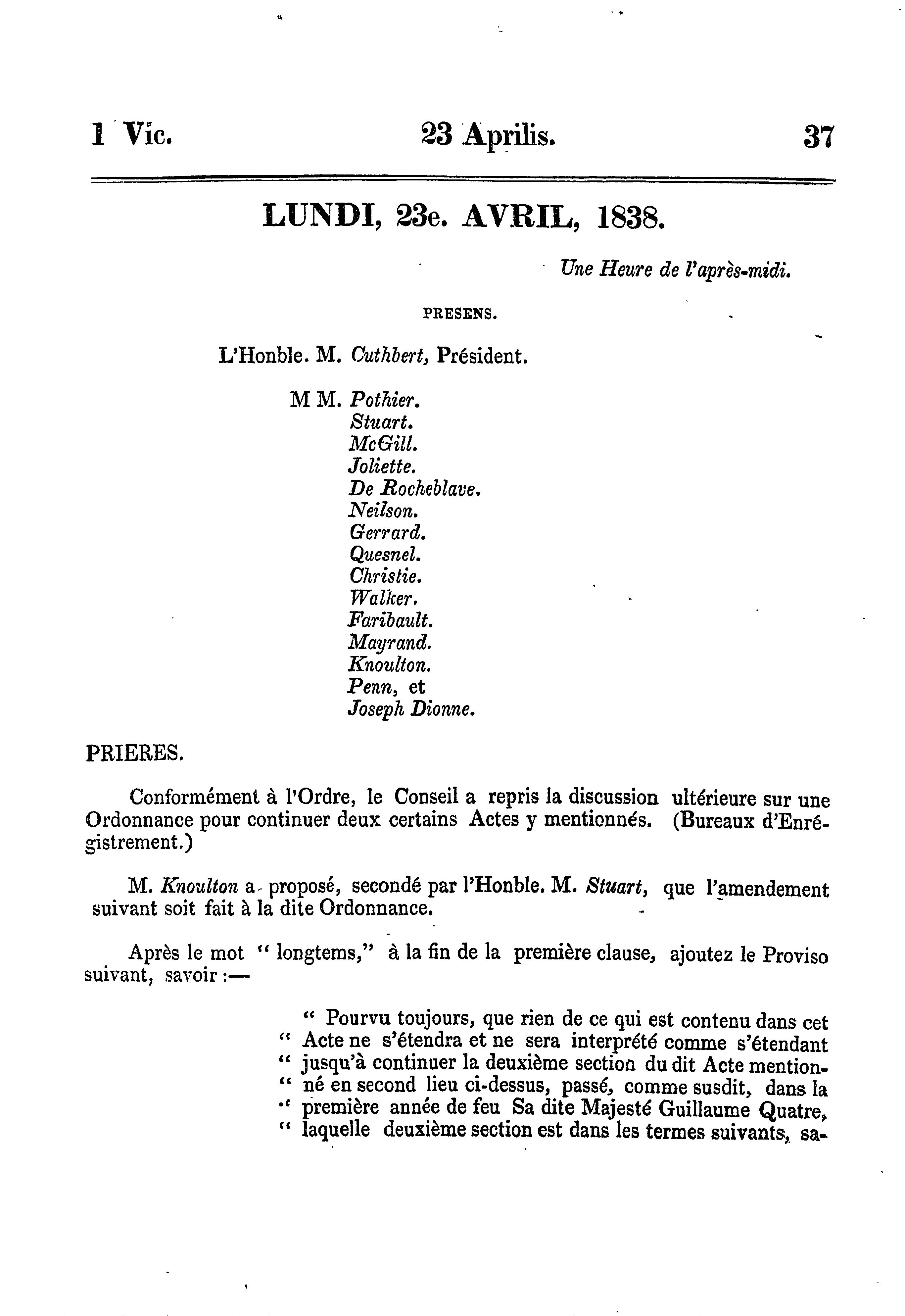 Journaux du Conseil spécial de la province du Bas-Canada ... : Journaux du Conseil spécial de la province du Bas-Canada depuis le 18e avril, jusqu'au 5e mai, 1838 ... : [Vol. 1] (1838)