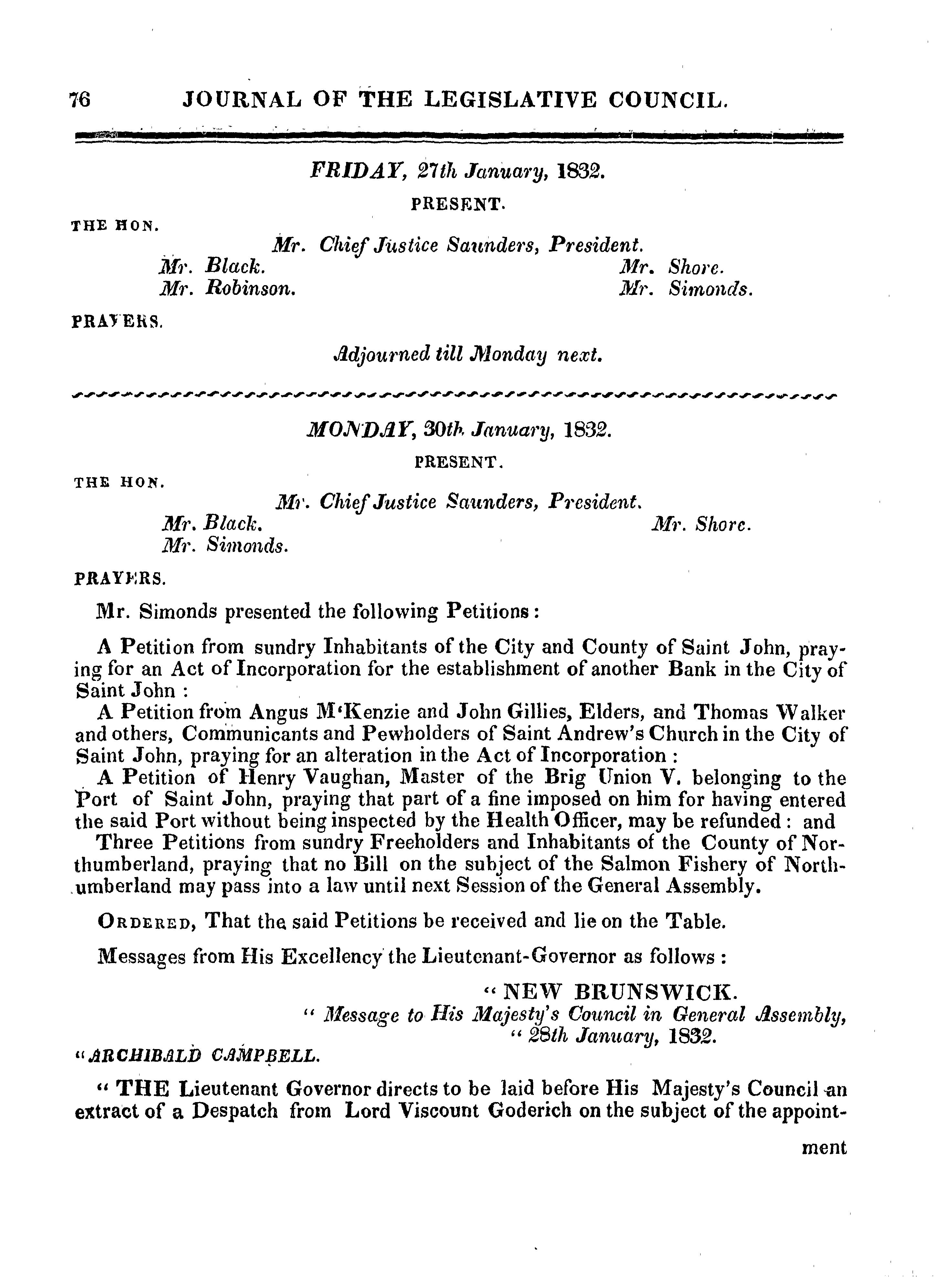 Journal of the Legislative Council of the province of New Brunswick ... : Journal of the Legislative Council of the province of New Brunswick from 19th January to 9th March, 1832, being the second session of the tenth General Assembly and from 3d May to 7th May, 1832, being the third session of the Tenth General Assembly : 1832