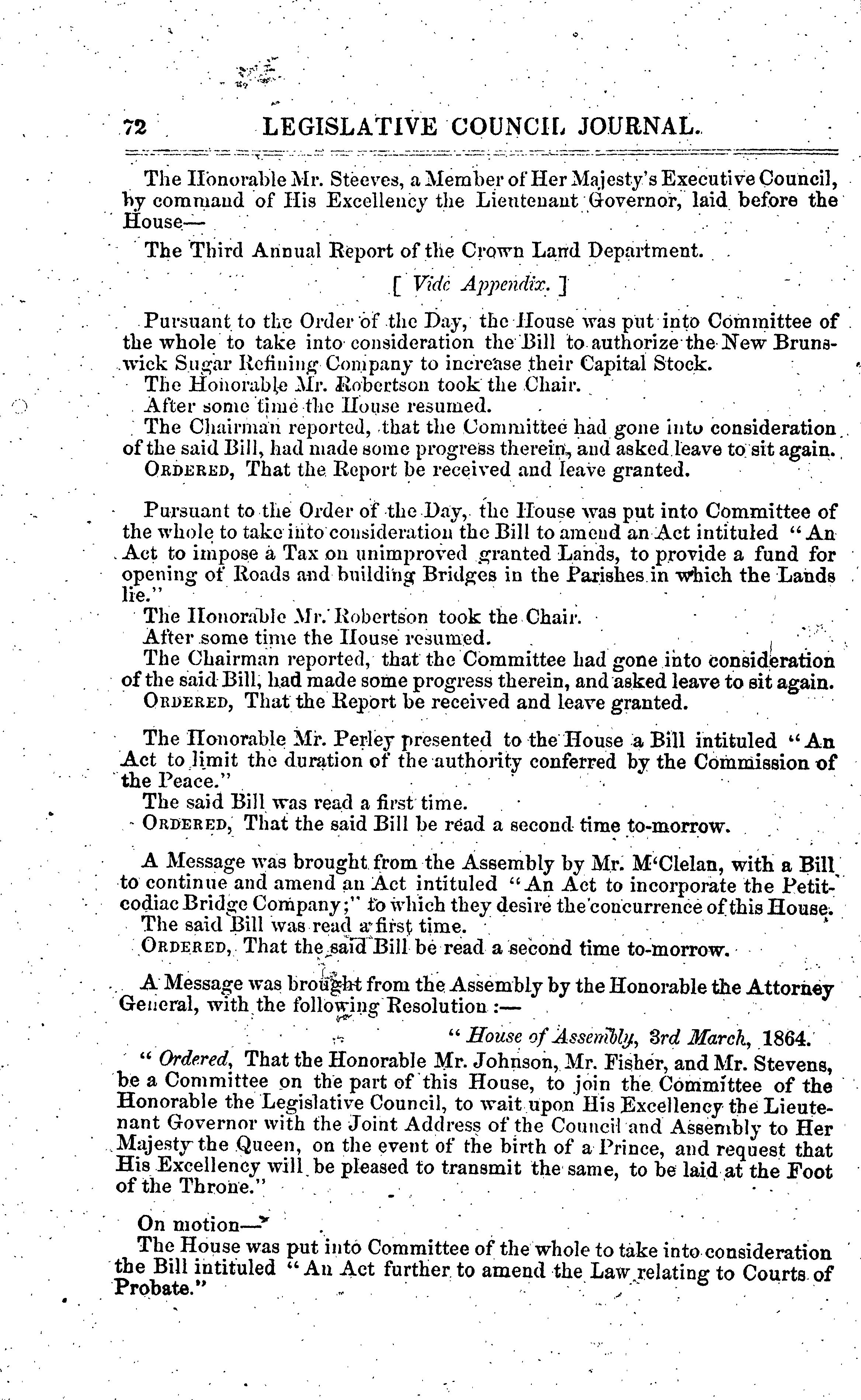 Journal of the Legislative Council ... of New Brunswick from the sixteenth February to the thirteenth April, 1864, ... third session of the nineteenth General Assembly : 1864