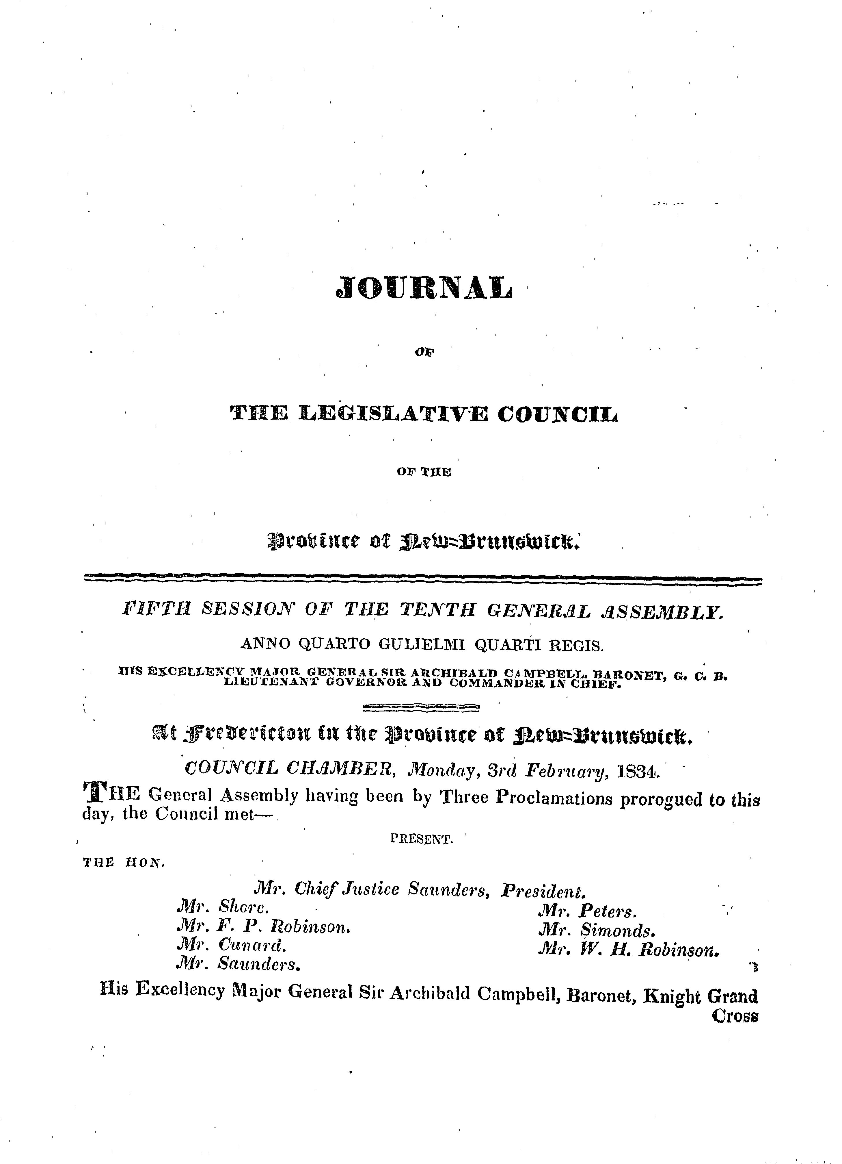 - Journal of the Legislative Council of the province of New Brunswick from 3d February to 22d March, 1834, being the fifth session of the tenth General Assembly : 1834