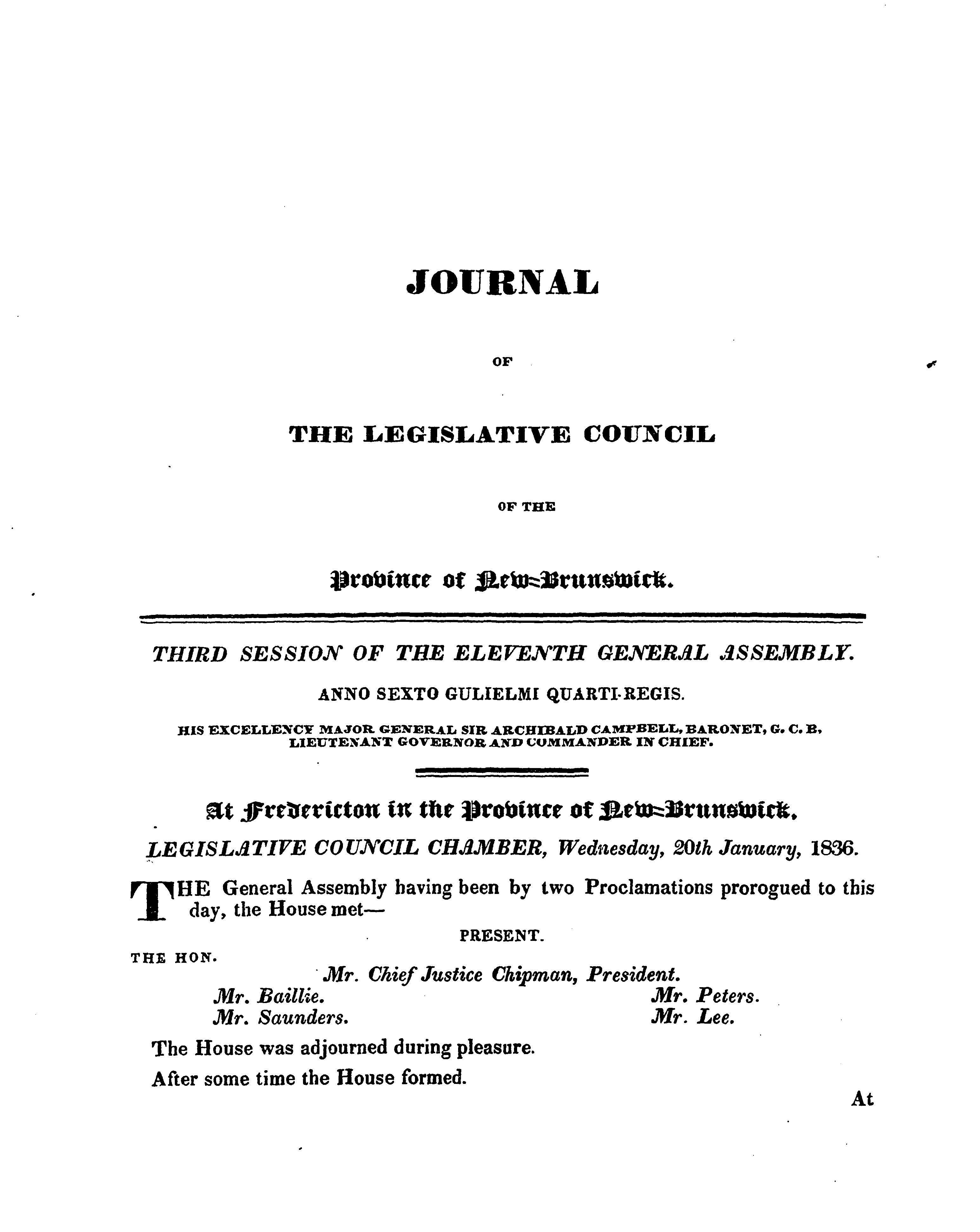 Journal of the Legislative Council ... of New Brunswick from 20th January to 16th March 1836, ... third session of the eleventh General Assembly : 1836