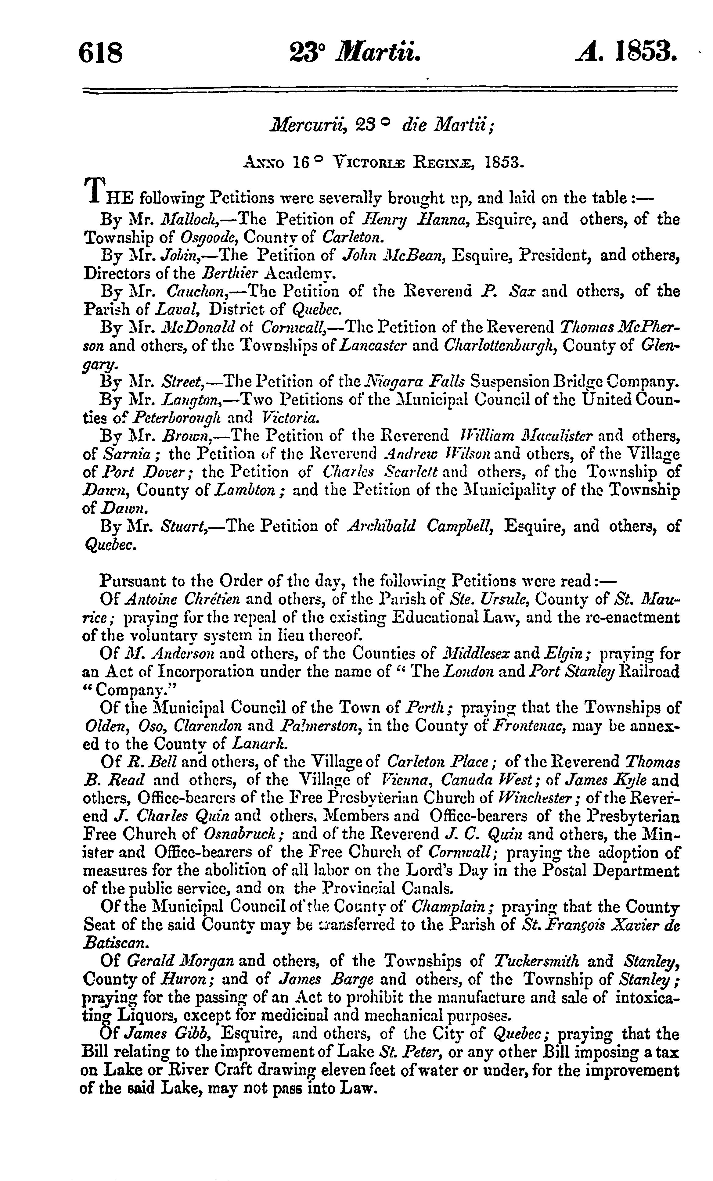 Journals of the Legislative Assembly of the Province of Canada ... and in the sixteenth year of the reign of ... Queen Victoria : being the 1st Session of the 4th Provincial Parliament of Canada : part I, 19th August, 1852 to 26th April, 1853 : 1852/53 (pt. 1)