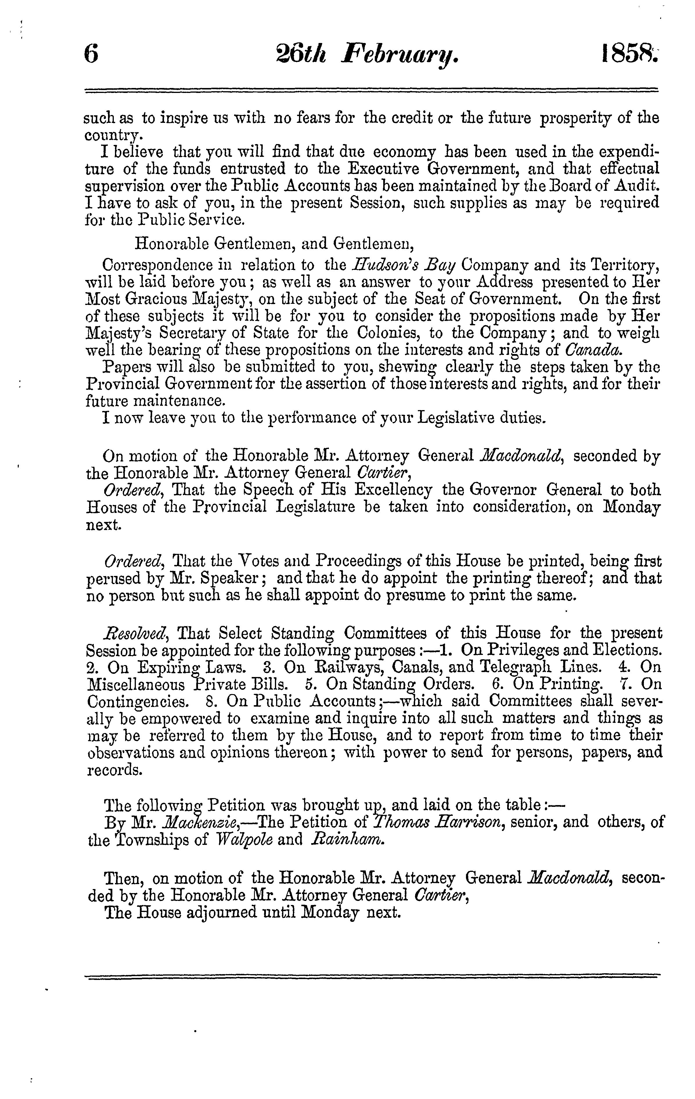 Journals of the Legislative Assembly of the Province of Canada from the 25th February to the 1st June, 1858 in the twenty-first and twenty-second years of the reign of ... Queen Victoria : being the 1st session of the 6th Provincial Parliament of Canada : part I : 1858 (pt. 1)