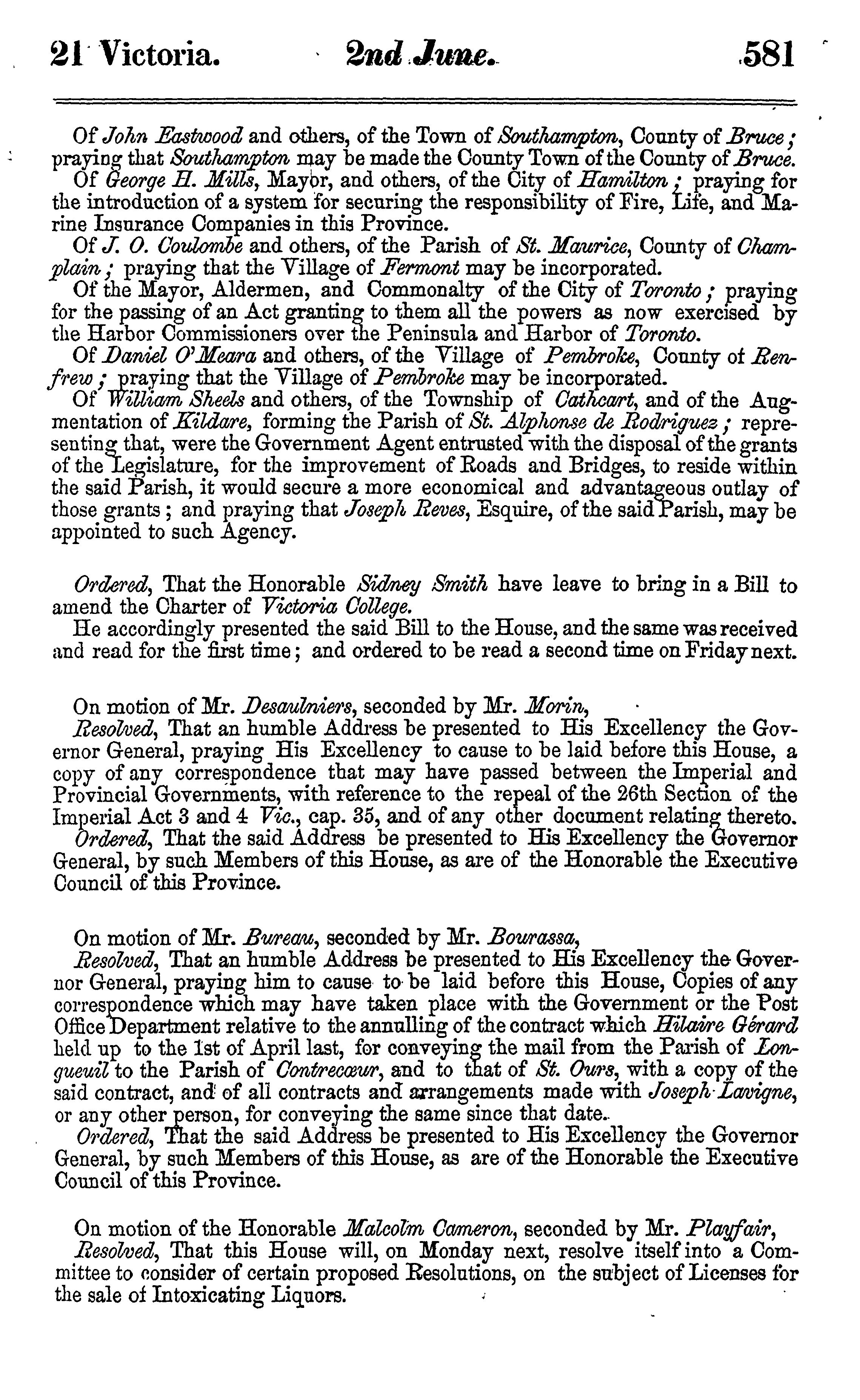 Journals of the Legislative Assembly of the Province of Canada from the 1st June to the 16th August, 1858 ... in the twenty-first and twenty-second years of the reign of ... Queen Victoria : being the 1st session of the 6th Provincial Parliament of Canada ; part II : 1858 (pt. 2)
