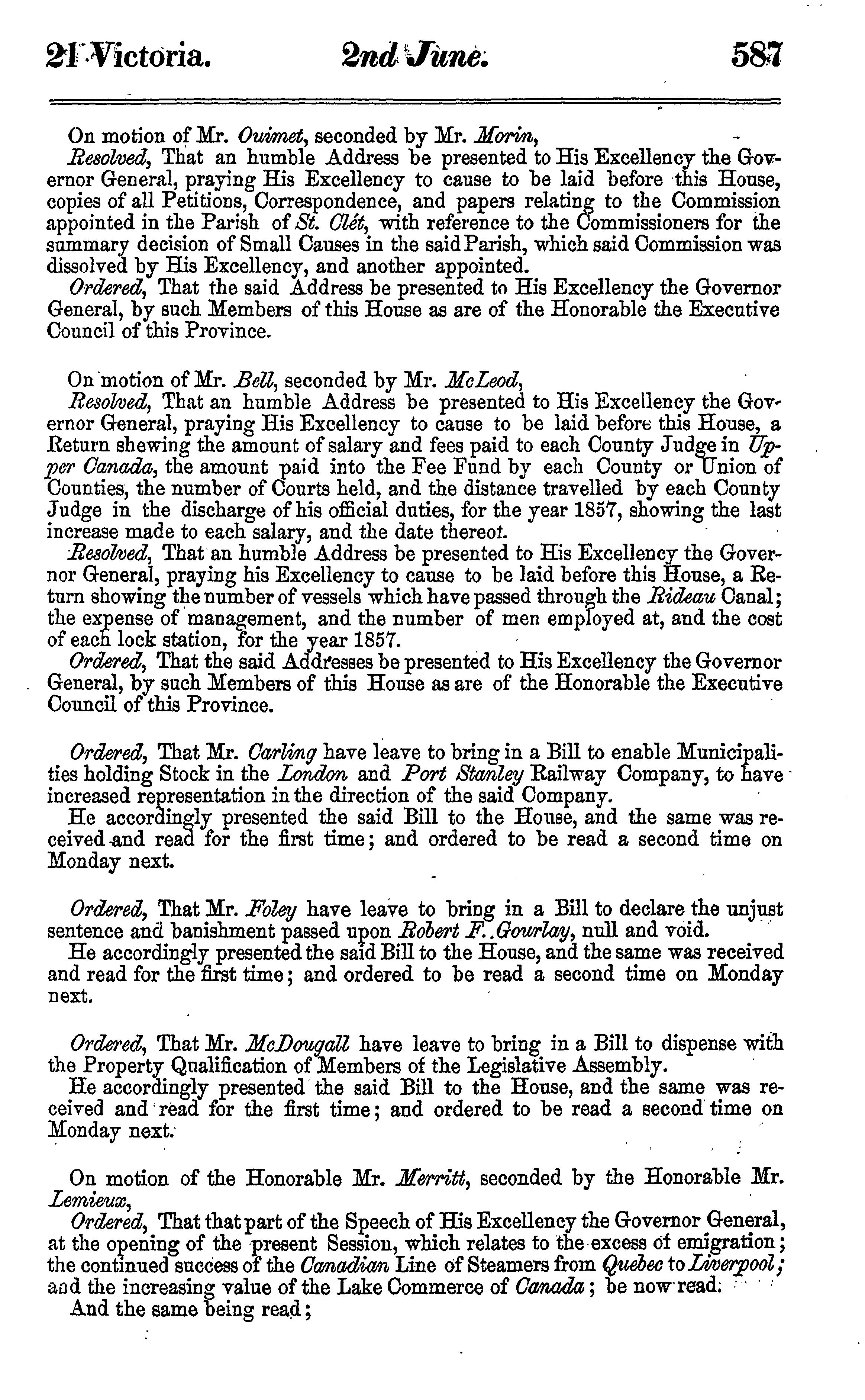 Journals of the Legislative Assembly of the Province of Canada from the 1st June to the 16th August, 1858 ... in the twenty-first and twenty-second years of the reign of ... Queen Victoria : being the 1st session of the 6th Provincial Parliament of Canada ; part II : 1858 (pt. 2)