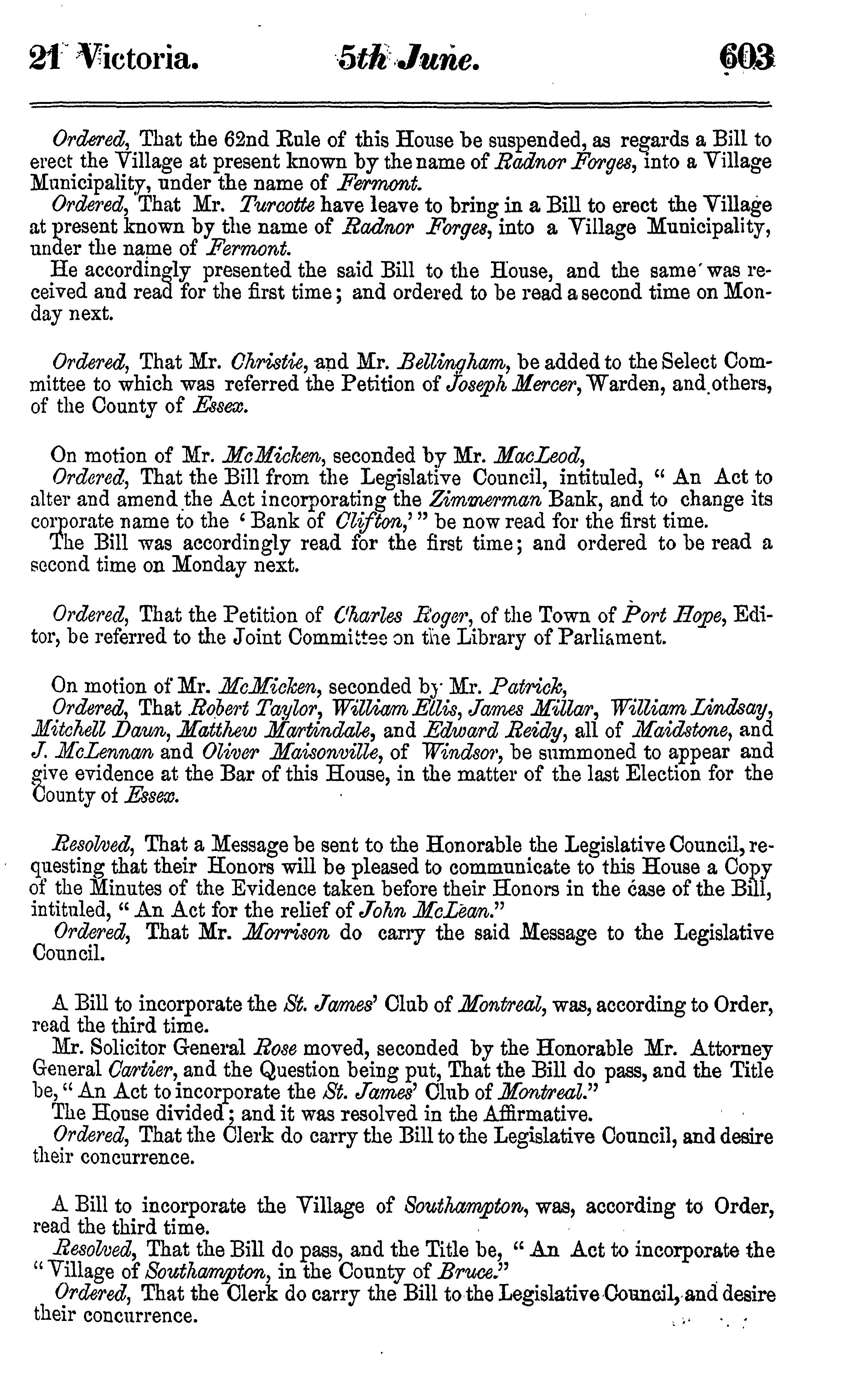 Journals of the Legislative Assembly of the Province of Canada from the 1st June to the 16th August, 1858 ... in the twenty-first and twenty-second years of the reign of ... Queen Victoria : being the 1st session of the 6th Provincial Parliament of Canada ; part II : 1858 (pt. 2)
