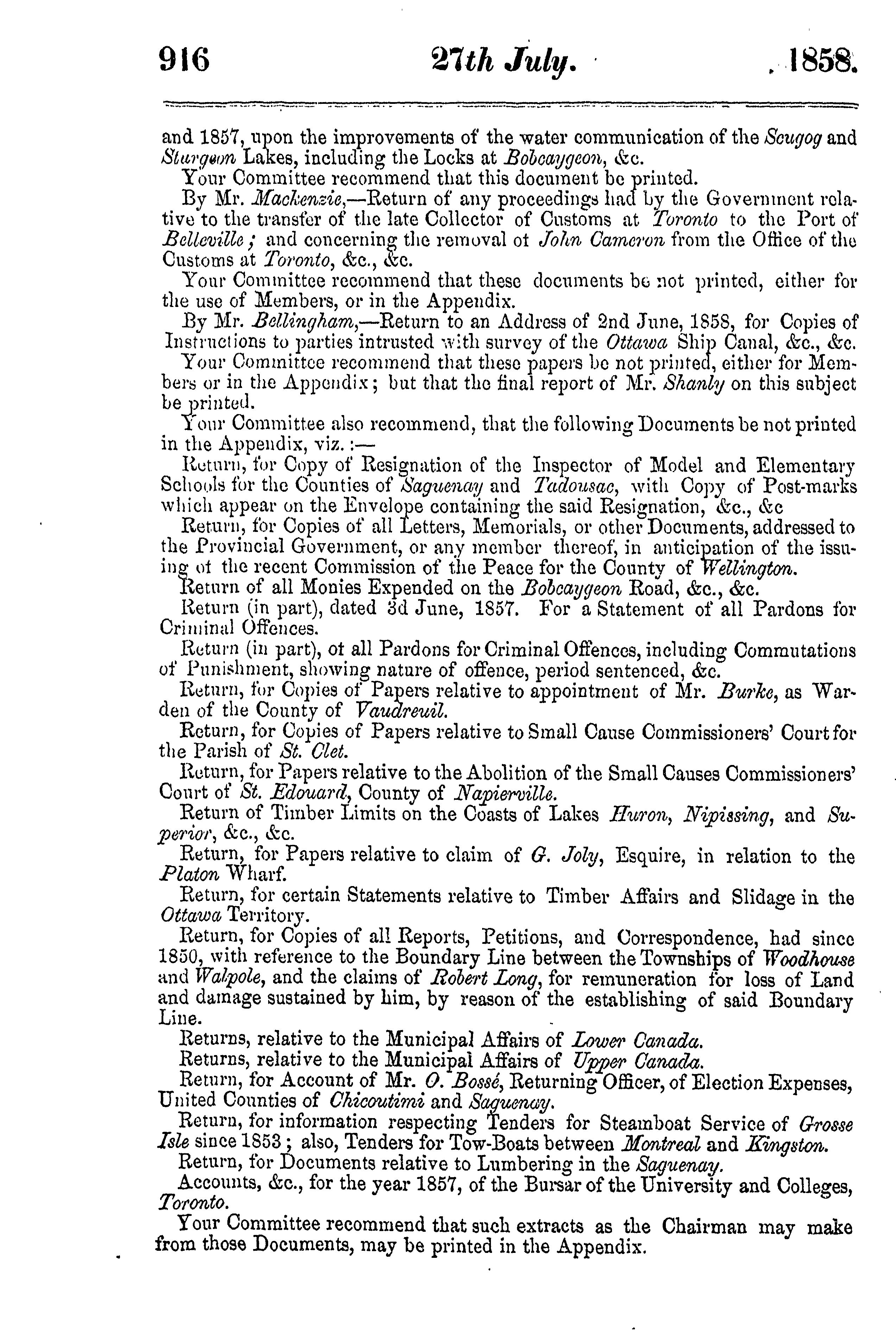 Journals of the Legislative Assembly of the Province of Canada from the 1st June to the 16th August, 1858 ... in the twenty-first and twenty-second years of the reign of ... Queen Victoria : being the 1st session of the 6th Provincial Parliament of Canada ; part II : 1858 (pt. 2)