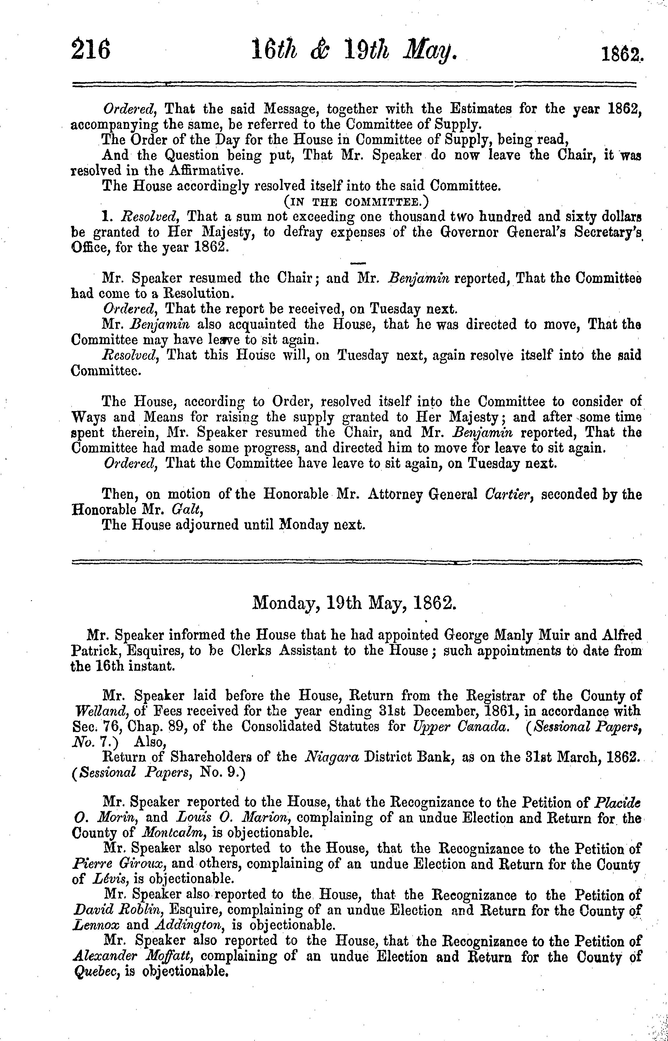 Journals of the Legislative Assembly of the Province of Canada from March 26 to June 9, 1862 ... in the twenty-fifth year of the reign of ... Queen Victoria : being the 1st session of the 7th Provincial Parliament of Canada : 1862
