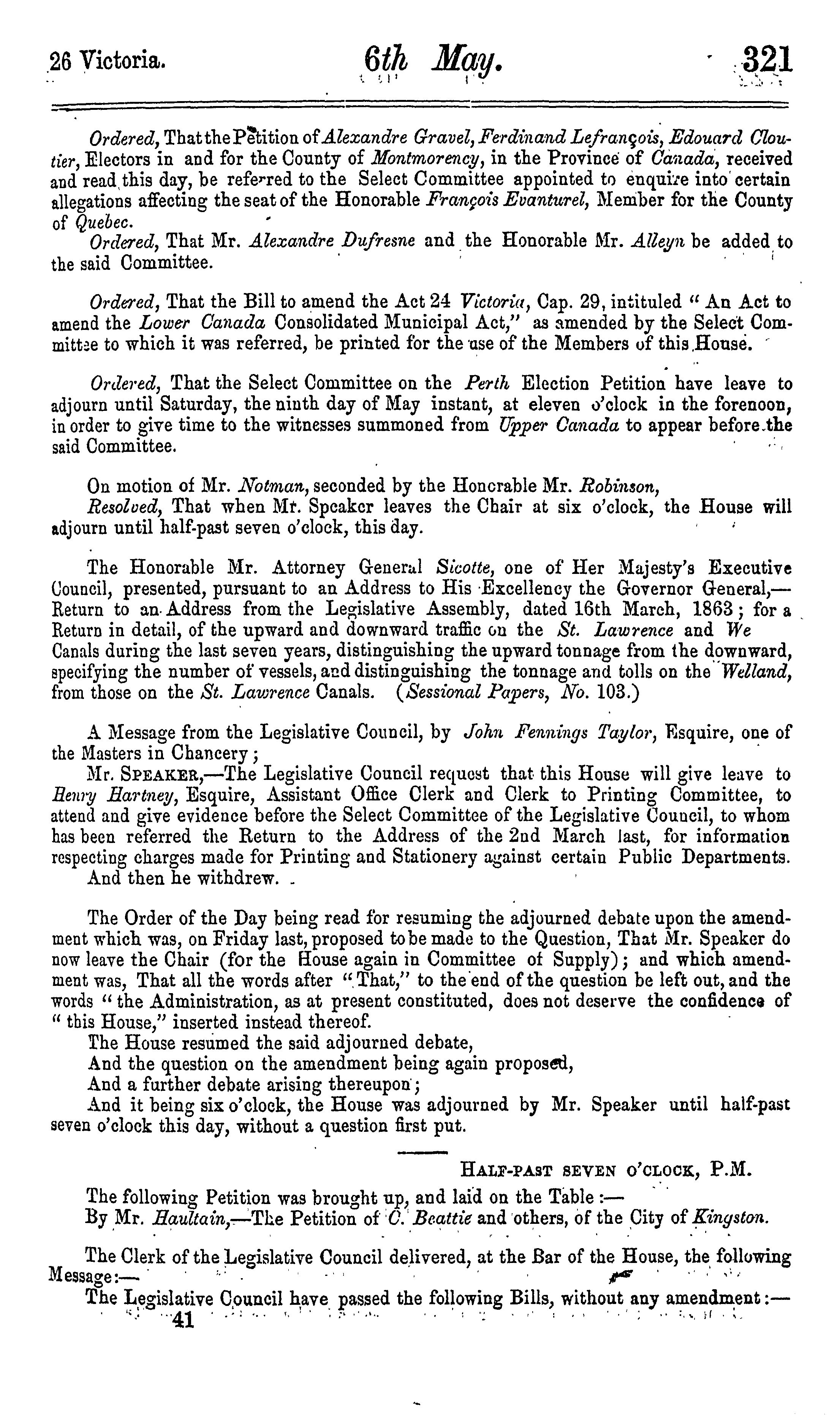 Journals of the Legislative Assembly of the Province of Canada from February 12 to May 12, 1863 ... in the twenty-sixth year of the reign of ... Queen Victoria : being the 2nd session of the 7th Provincial Parliament of Canada : 1863