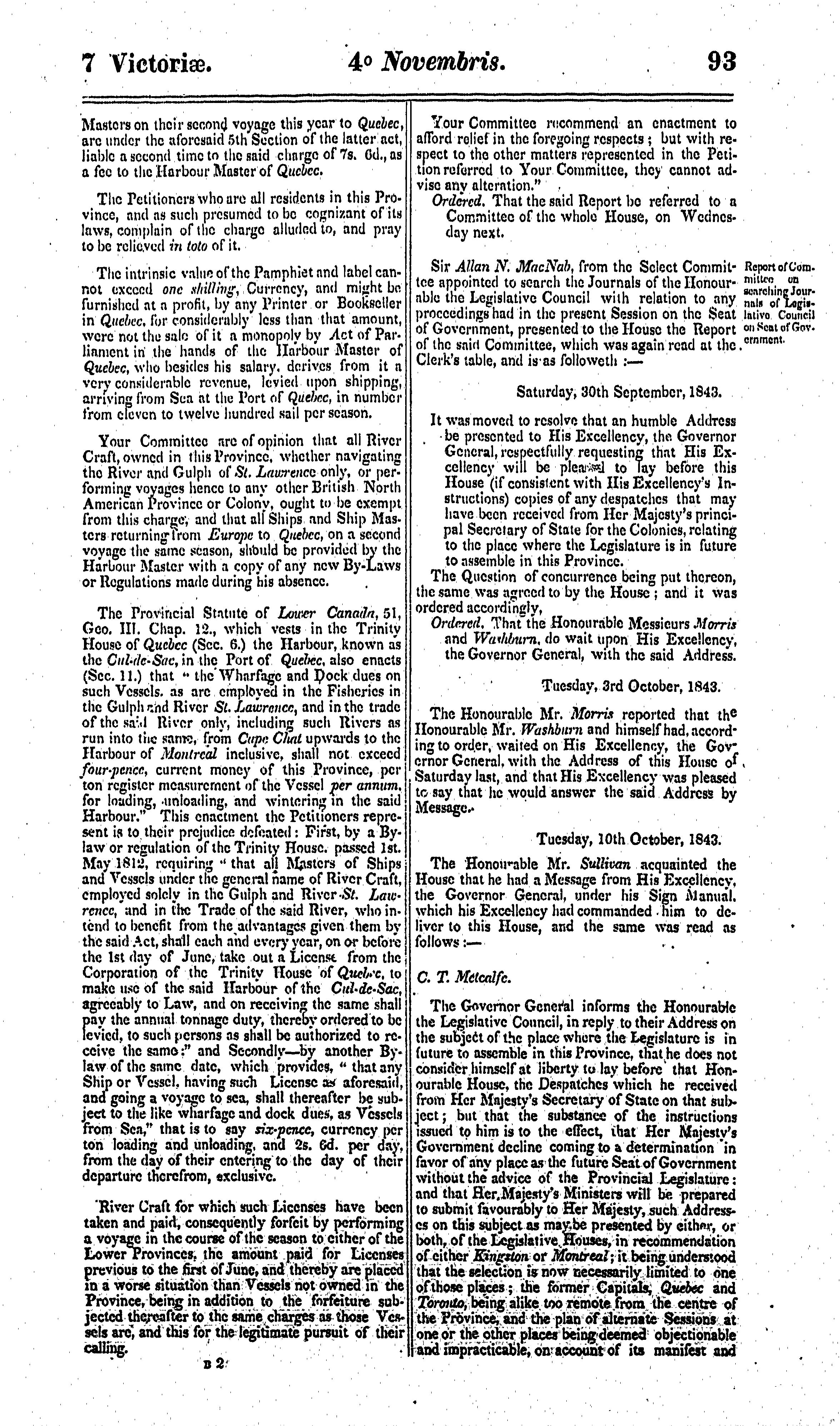 Journals of the Legislative Assembly of the Province of Canada from the 28th day of September to the 9th day of December in the year of Our Lord 1843 and in the seventh year of the reign of ... Queen Victoria : being the third session of the first Provincial Parliament of Canada : 1843