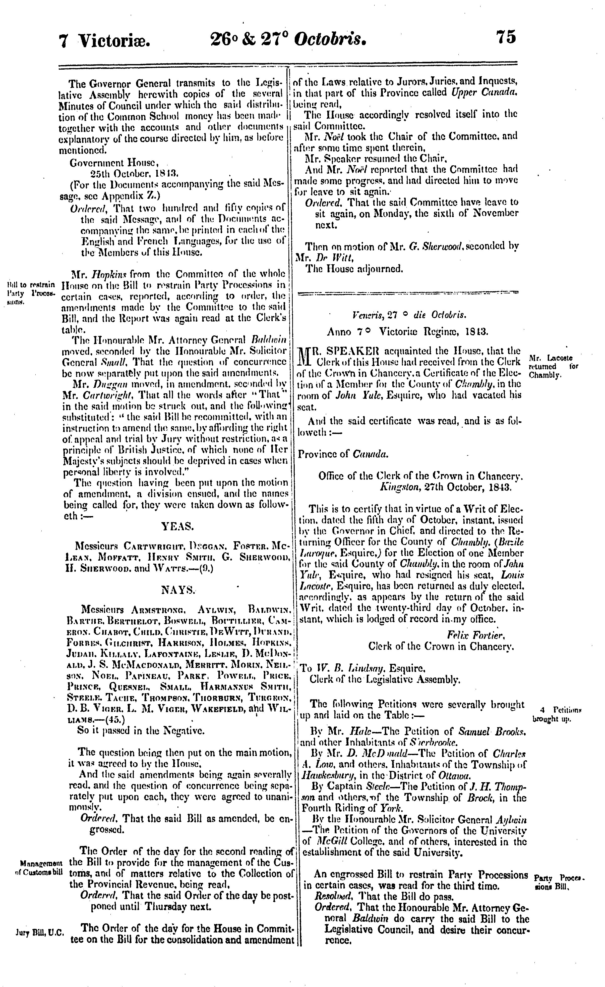 Journals of the Legislative Assembly of the Province of Canada from the 28th day of September to the 9th day of December in the year of Our Lord 1843 and in the seventh year of the reign of ... Queen Victoria : being the third session of the first Provincial Parliament of Canada : 1843
