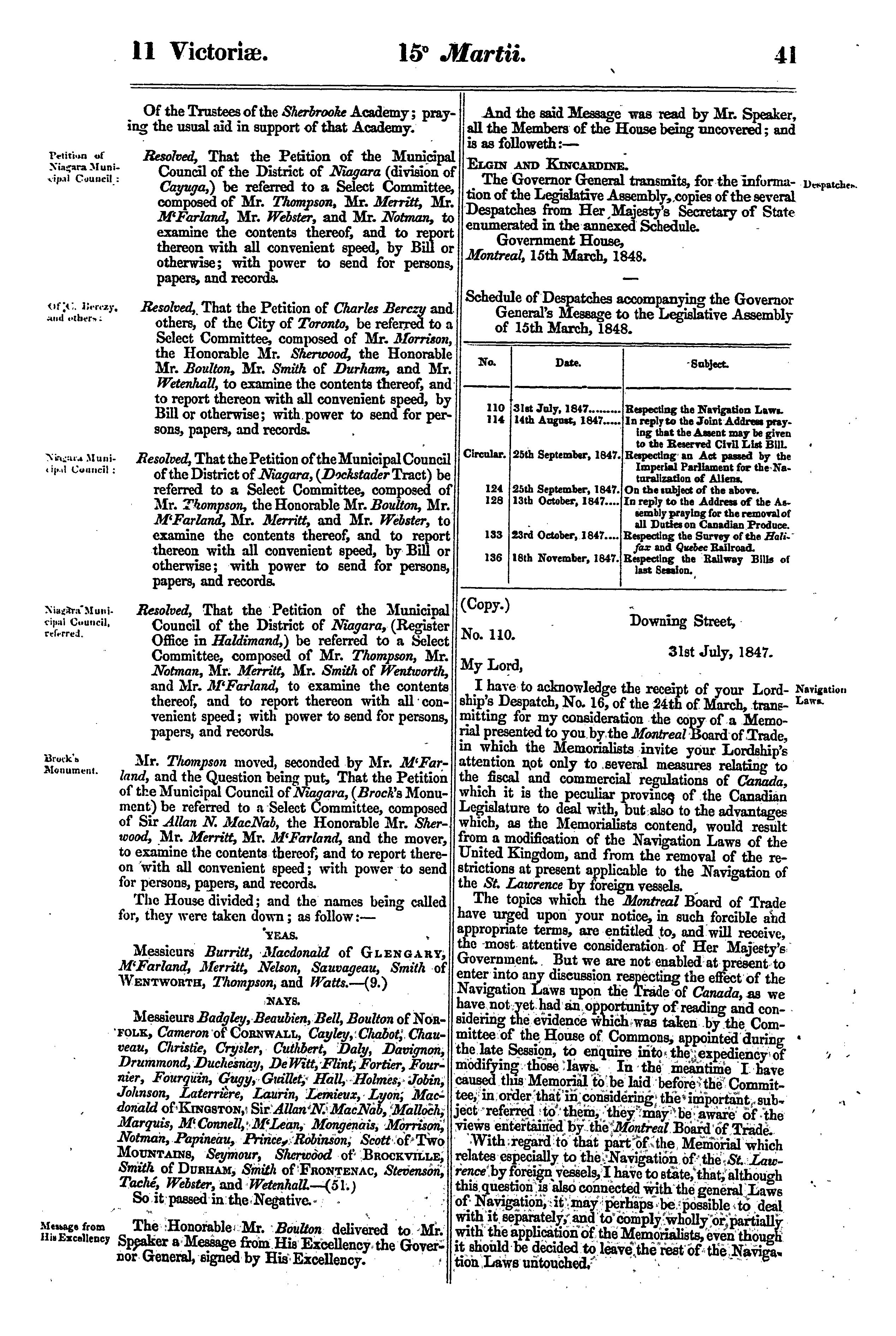 Journals of the Legislative Assembly of the Province of Canada, from the 25th day of February to the 23rd day of March, both days inclusive, and in the eleventh year of the reign of Our Sovereign Lady Queen Victoria, being the first session of the third provincial Parliament of Canada : 1848