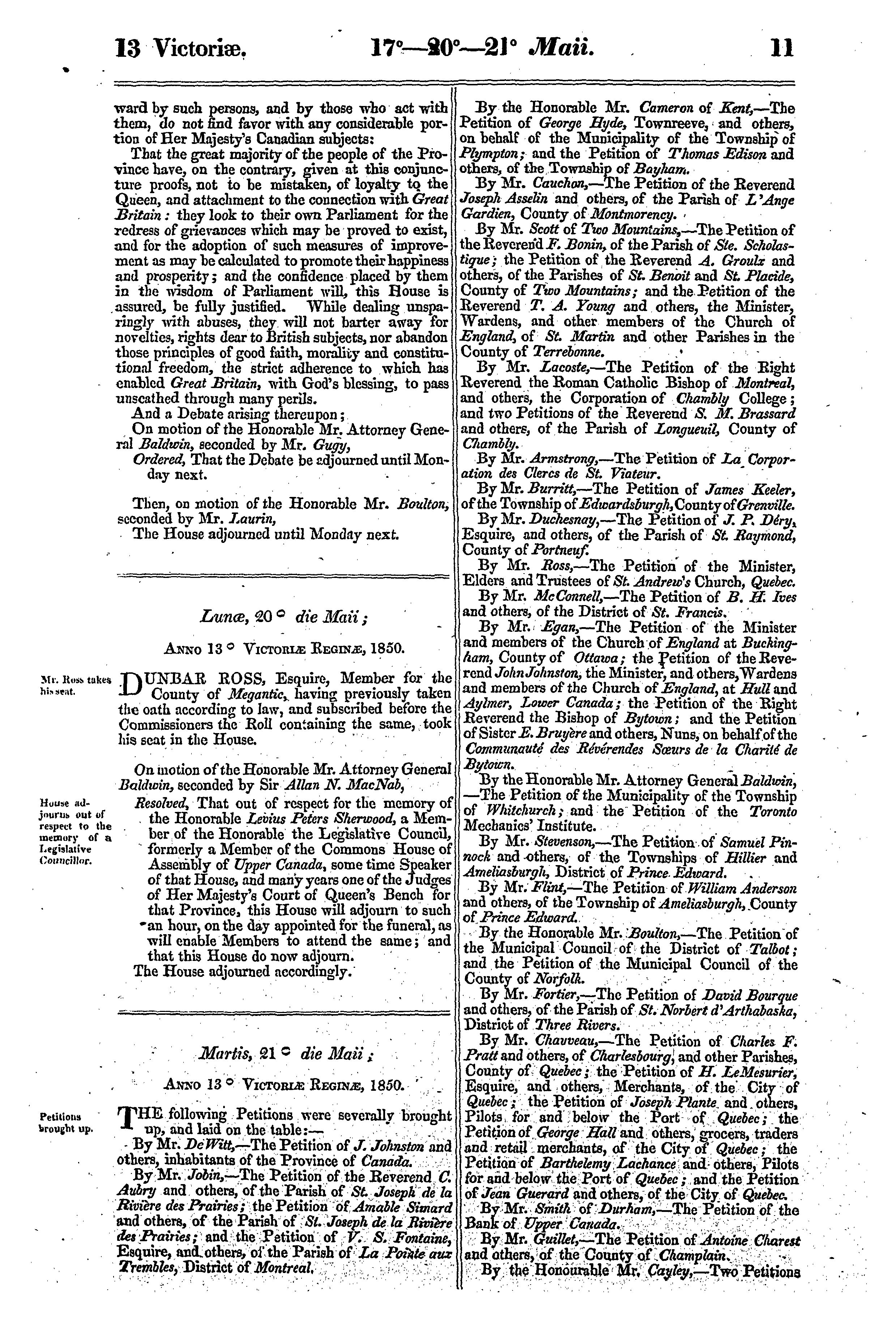 Journals of the Legislative Assembly of the Province of Canada from the 14th day of May to the 10th day of August, both days inclusive, and in the thirteenth and fourteenth years of the reign of Our Sovereign Lady Queen Victoria, being the third Session of the third provincial Parliament of Canada, Session 1850 : 1850