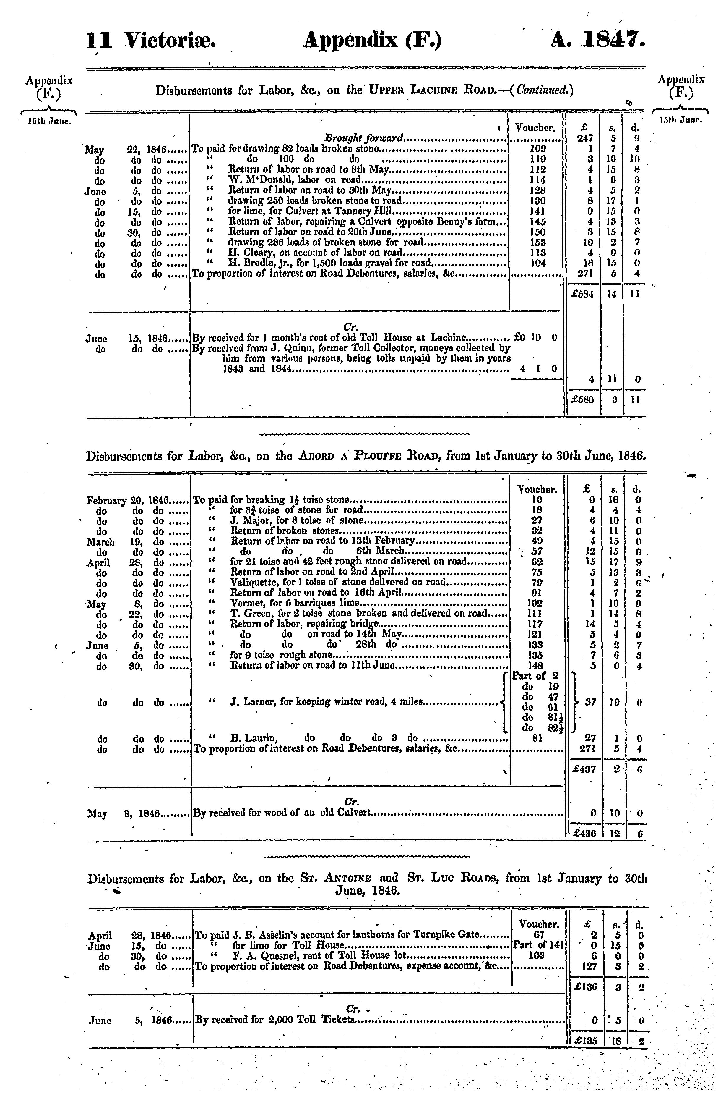 Appendix to the sixth volume of the journals of the Legislative Assembly of the Province of Canada, from the 2nd day of June to the 28th day of July, 1847, both days inclusive, and in the tenth and eleventh years of the reign of Our Sovereign Lady Queen Victoria, being the third session of the second provincial Parliament of Canada, session 1847 : 1847 (no. 1)