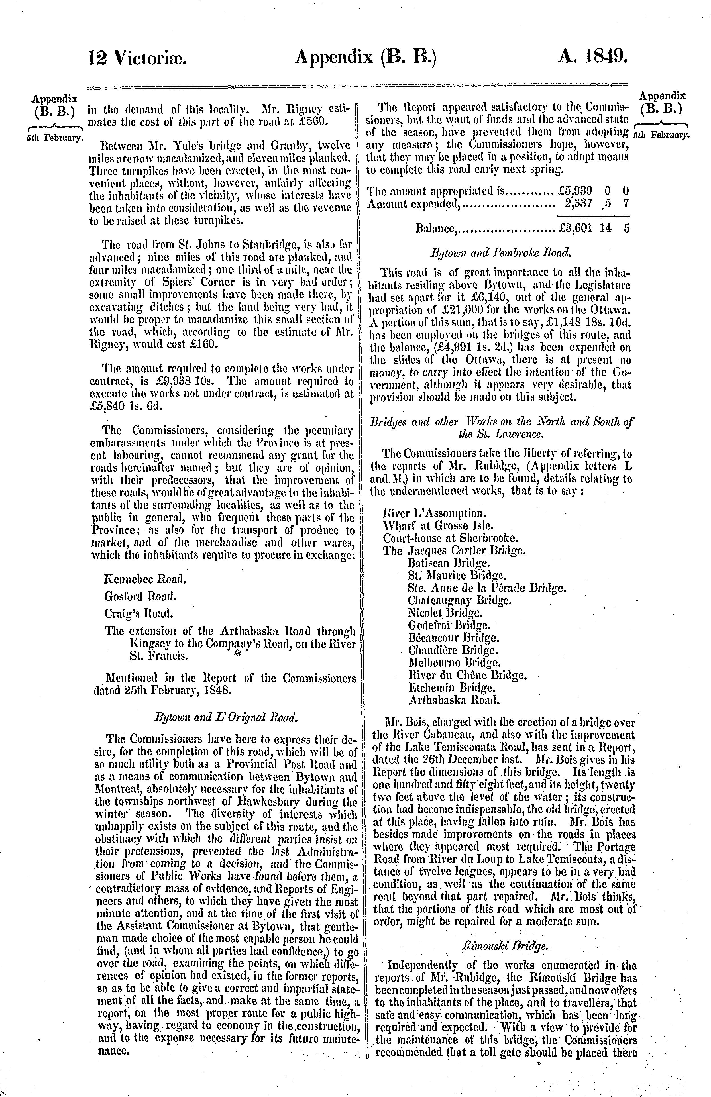Appendix to the eighth volume of the journals of the Legislative Assembly of the Province of Canada, from the 18th day of January to the 30th day of May, both days inclusive, and in the twelfth year of the reign of Our Sovereign Lady Queen Victoria, being the second session of the third provincial Parliament of Canada, session 1849 : 1849 (no. 2)