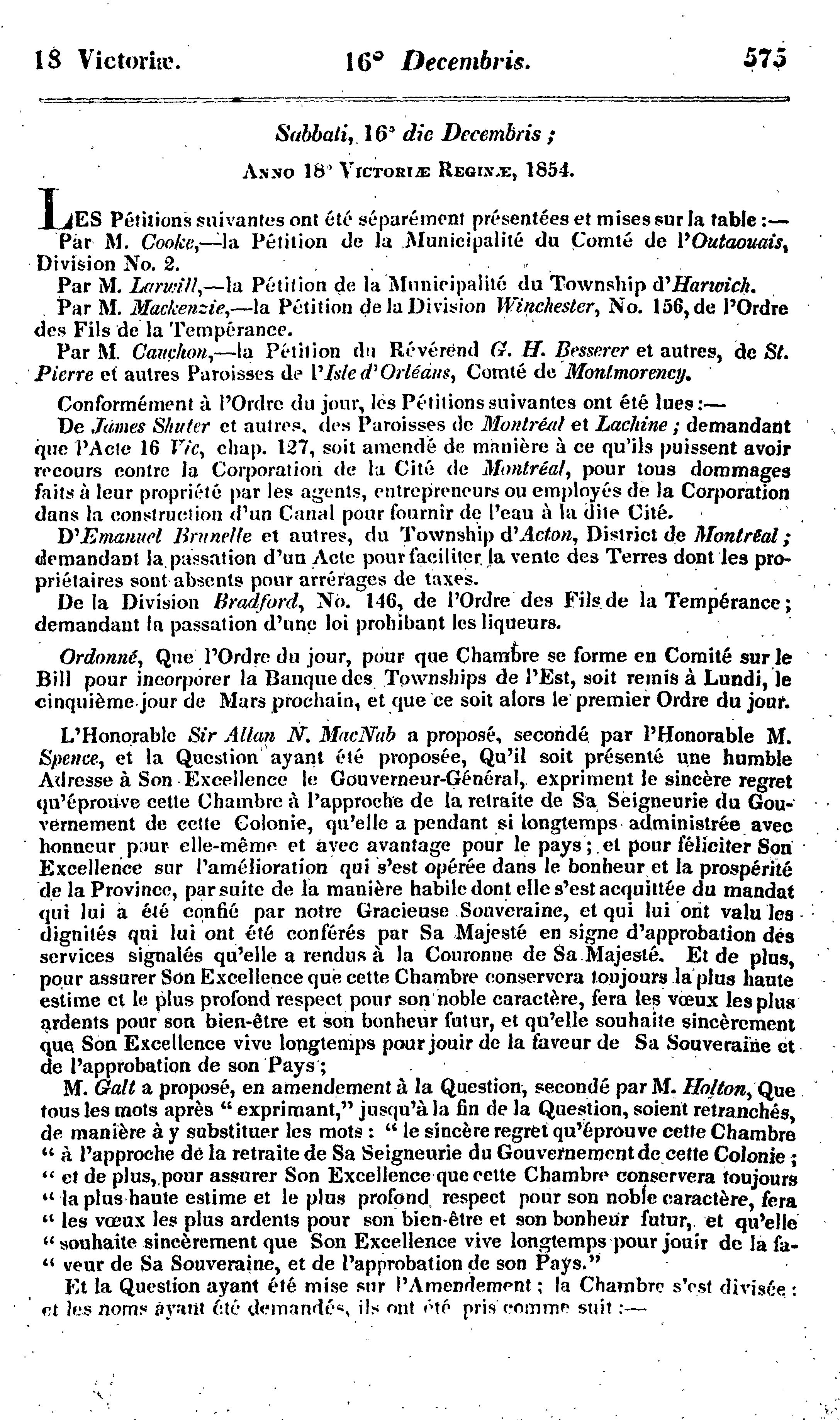 Journaux de l'Assemblée législative de la Province du Canada depuis le 5 septembre jusqu'au 18 décembre 1854, ces deux jours inclus, dans la dix-huitième année du règne de notre souveraine dame la Reine Victoria : première session du 5me Parlement provincial du Canada : (première partie) : 1854/55 (pt. 1)