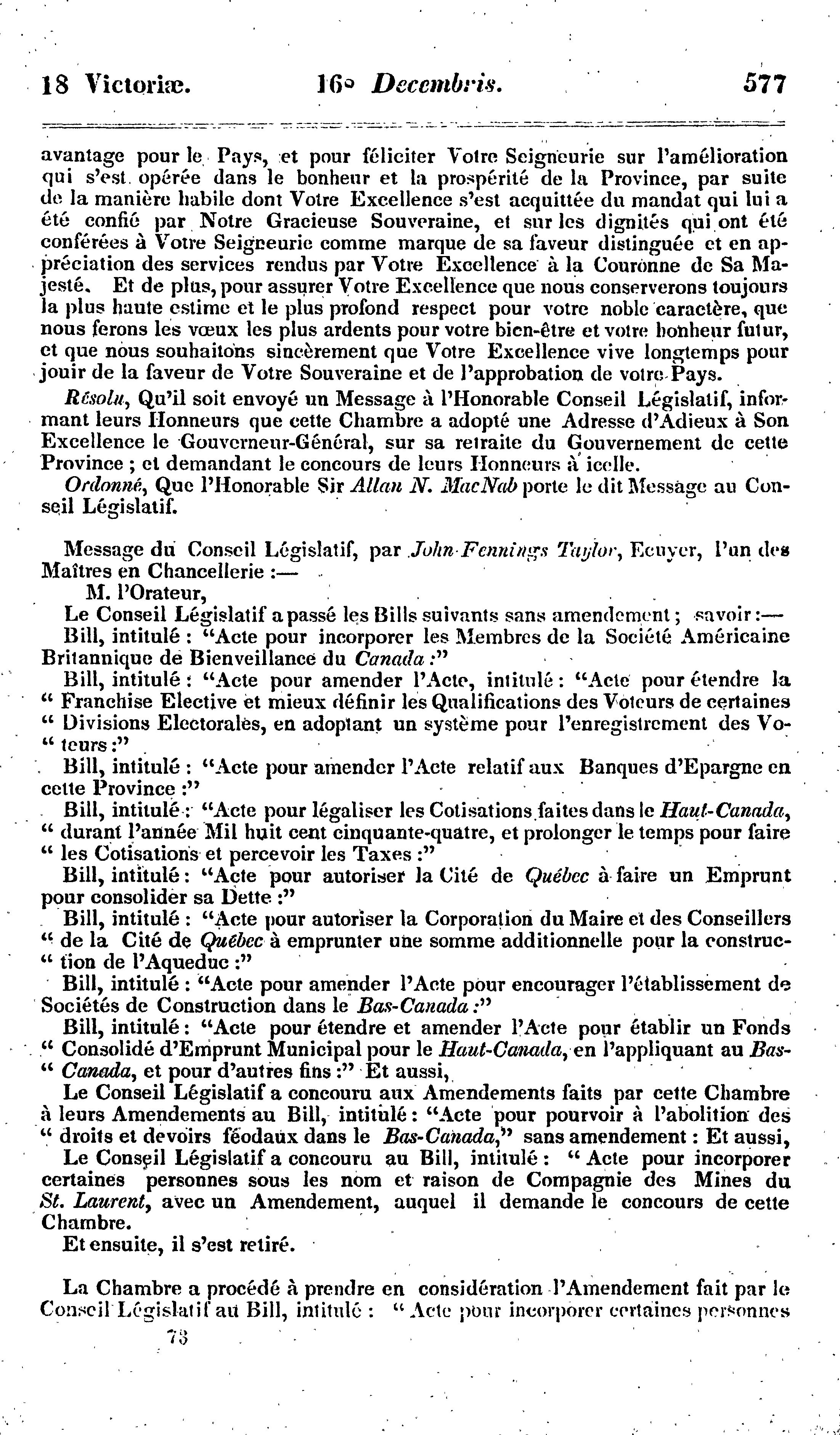 Journaux de l'Assemblée législative de la Province du Canada depuis le 5 septembre jusqu'au 18 décembre 1854, ces deux jours inclus, dans la dix-huitième année du règne de notre souveraine dame la Reine Victoria : première session du 5me Parlement provincial du Canada : (première partie) : 1854/55 (pt. 1)